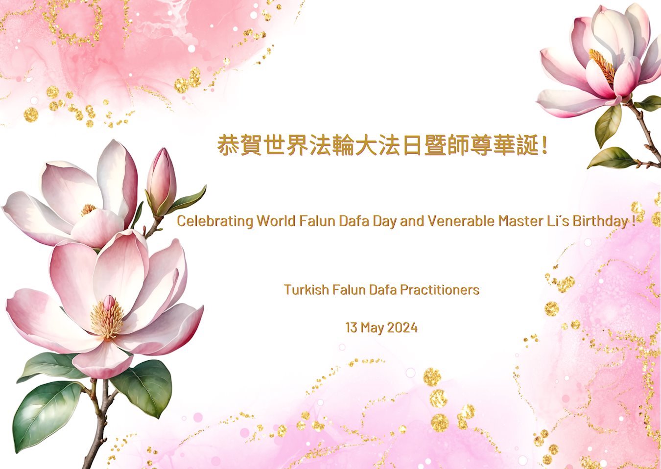 二零二四年五月十三日是第二十五届世界法轮大法日,暨法轮大法传世三十二周年。这一天也是法轮大法创始人李洪志师父华诞。从四月二十日的《难忘那年“五·一三”》开始至今,明慧网持续发表着中国大陆以及全世界一百多个国家法轮功学员制作的贺卡,发来的征文、故事、诗歌、音乐、绘画等作品。件件贺卡贺词、篇篇文章、则则故事,一幅幅书法绘画,众人以各种形式,同庆“五一三”世界法轮大法日这个带给人类希望与福祉、改变人类命运的重大节日,遥祝师父生日快乐。
