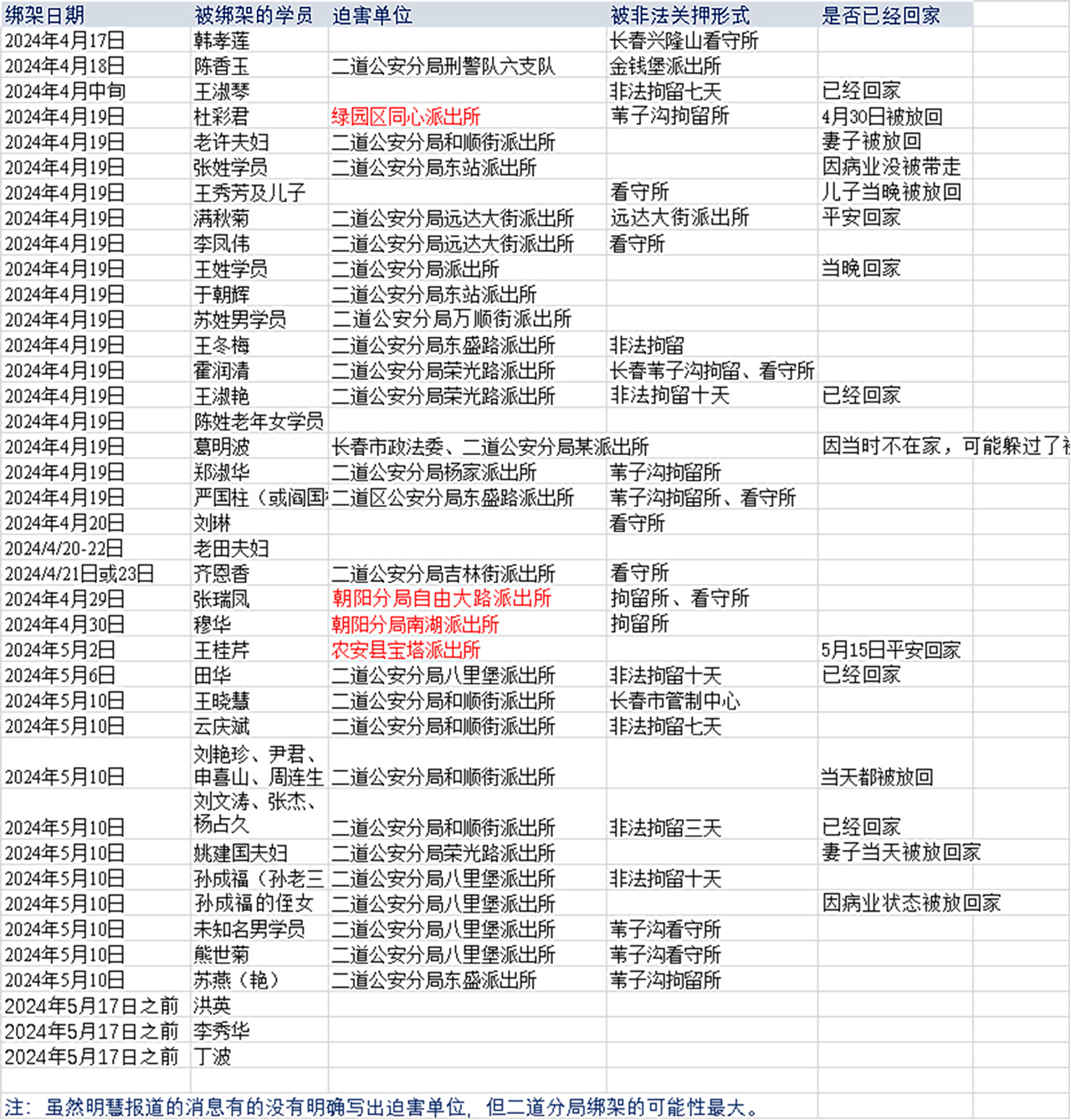 1. 韩孝莲:二零二四年四月十七日中午,长春市九台区法轮功学员韩孝莲被绑架并被非法关押在长春兴隆山看守所。