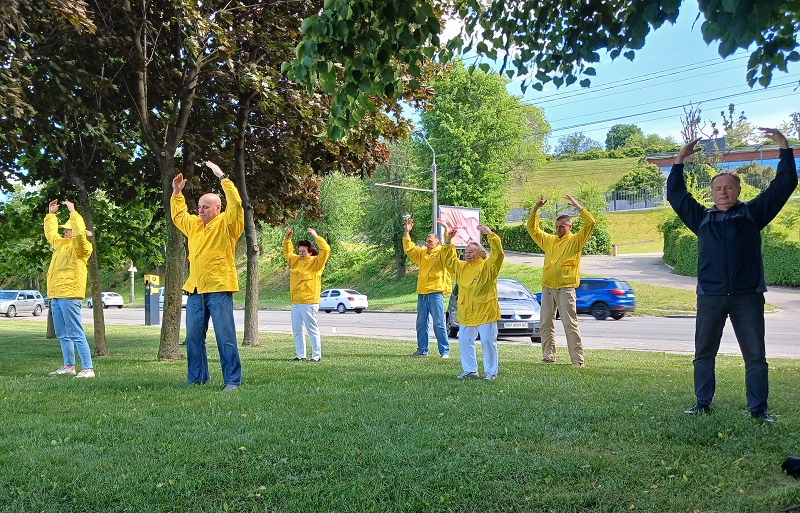 学员们展示了法轮功功法,并且发给路人法轮大法简介传单。他们还向感兴趣的人们提供更多了解法轮大法的网站链接,包括学炼功法和阅读大法书籍的网站。