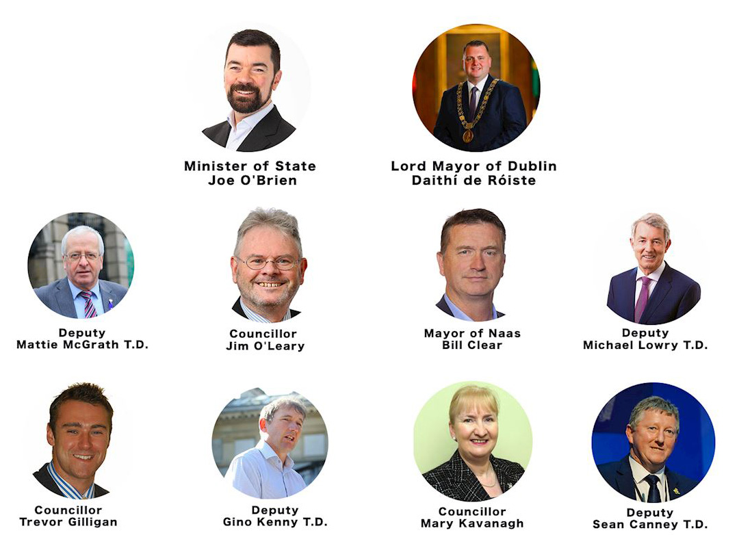 第三排从左至右:爱尔兰郡议员特雷弗・吉利根(Trevor Gilligan)、众议员吉诺・肯尼(Gino Kenny)、众议员玛丽・卡瓦纳(Mary Kavanagh)、和众议员肖恩・肯尼(Seán Canney)