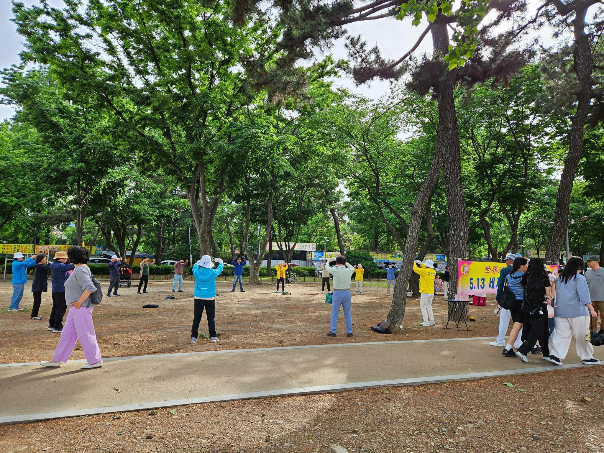 二零二四年神韵艺术团在韩国的演出圆满落幕后的第二天,暨五月十二日,法轮功学员心怀着对师尊的感恩聚集在青瓦台前,举行了庆祝世界法轮大法日及祝贺师尊华诞活动,然后随着祥和的炼功音乐集体炼功。
