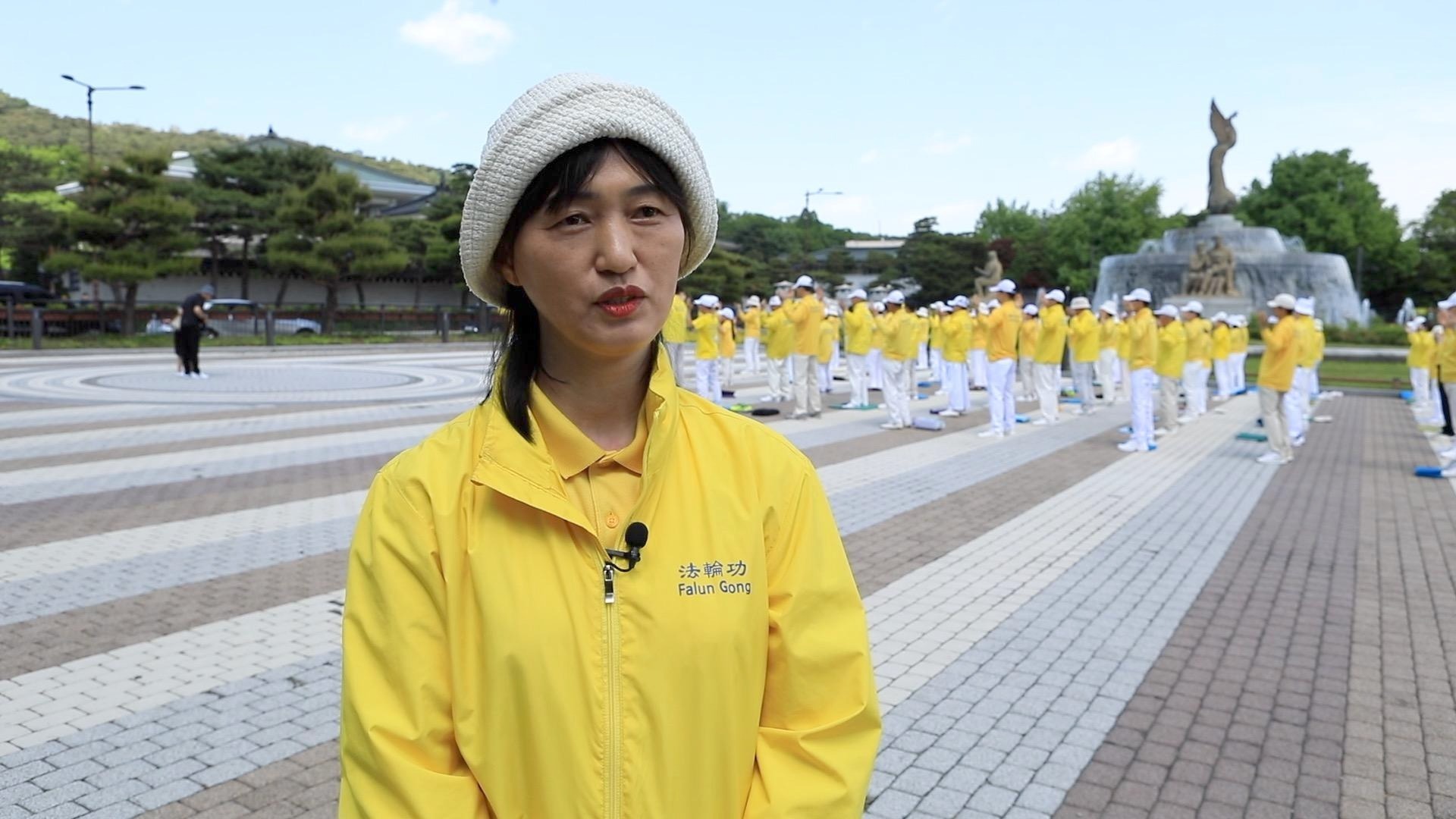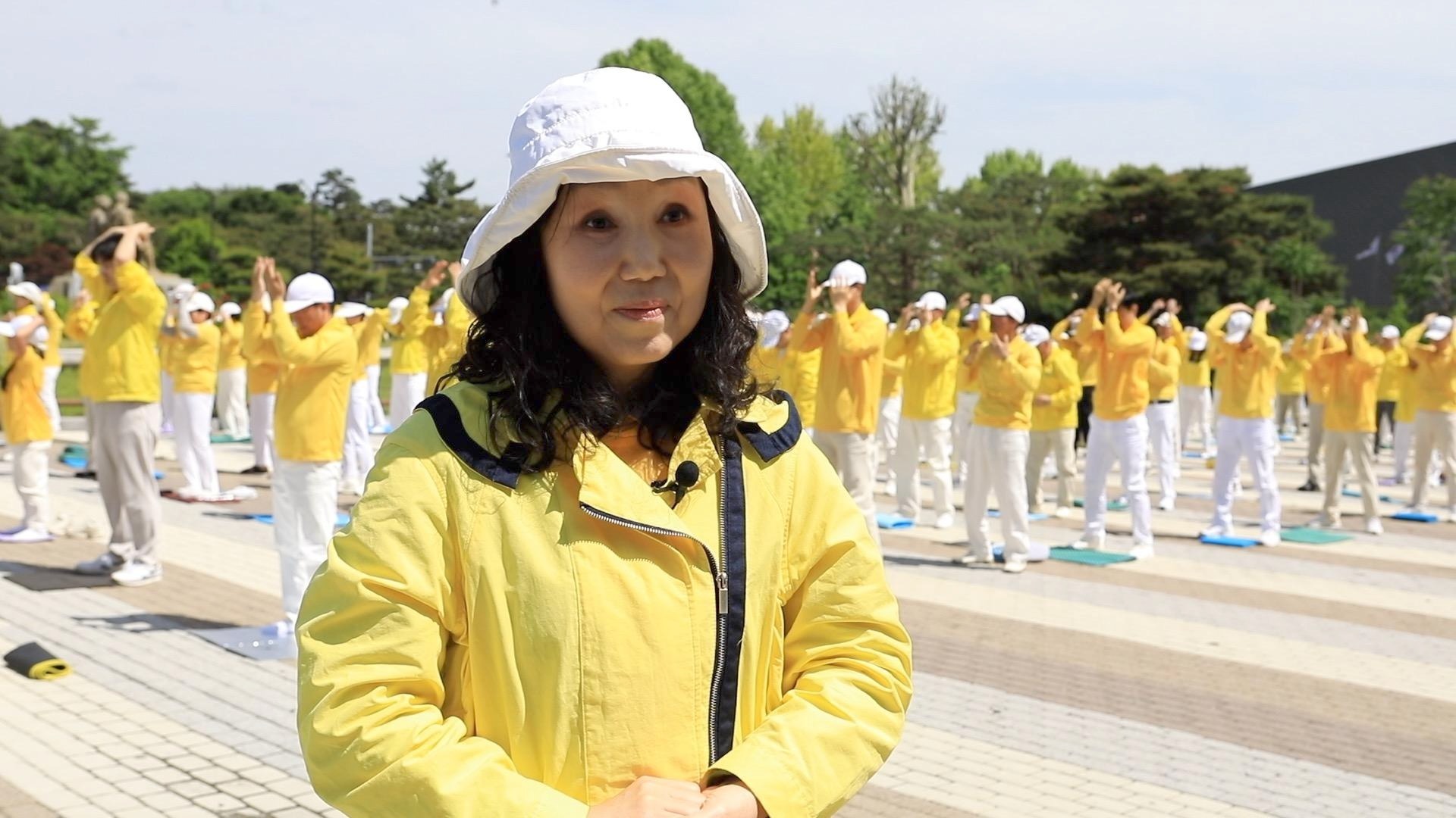 李夏英(이하영),去年在朋友的推荐下,开始修炼。因为腰痛,她无法盘腿打坐。今年年初,通过参加九天学习班,她能够盘腿打坐了,并且逐渐延长了打坐时间。李女士说:“修炼前需要戴上老花眼镜才能看的清楚,但修炼后视力恢复,在工作时不用戴眼镜也能看清了,这让我感到很神奇。”她还说:“在日常生活中实践‘真、善、忍’,我和孩子的关系变的更和谐了,遇到困难也能顺利的解决。”