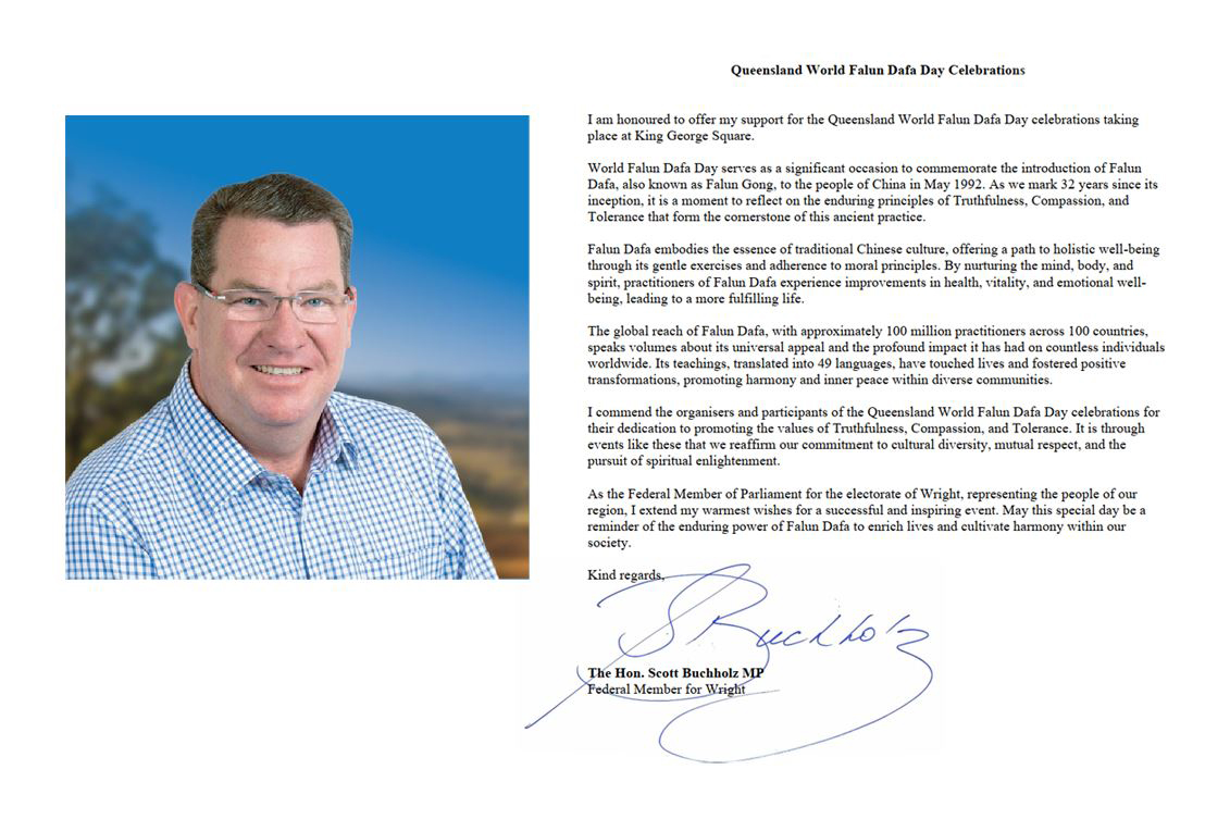 联邦议员斯科特·布赫霍尔茨(The Hon. Scott Buchholz MP Federal Member for Wright)在恭贺法轮大法日的贺信中说:“世界法轮大法日是纪念法轮大法于一九九二年五月从中国开传的重要日子。在纪念法轮大法创立三十二周年之际,我们应该思考构成这一古老修炼法门基石的真、善、忍的永恒法理。”