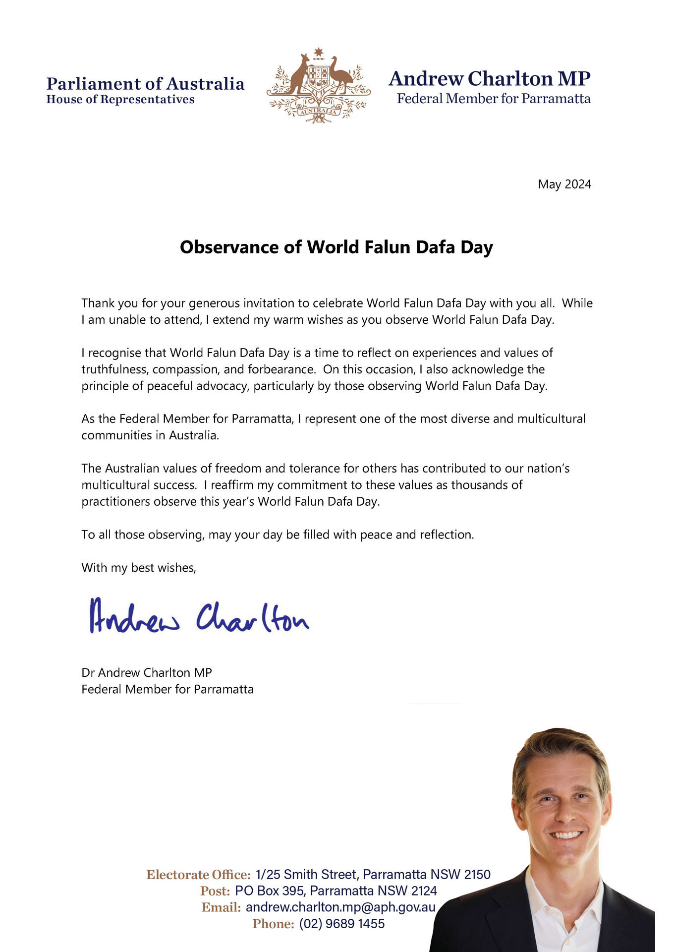 联邦议员安德鲁·查尔顿博士(Dr Andrew Charlton MP,Federal Member for Parramatta)在贺信中表示,“我认识到世界法轮大法日是一个重温和体验真、善、忍价值观的时刻 。”