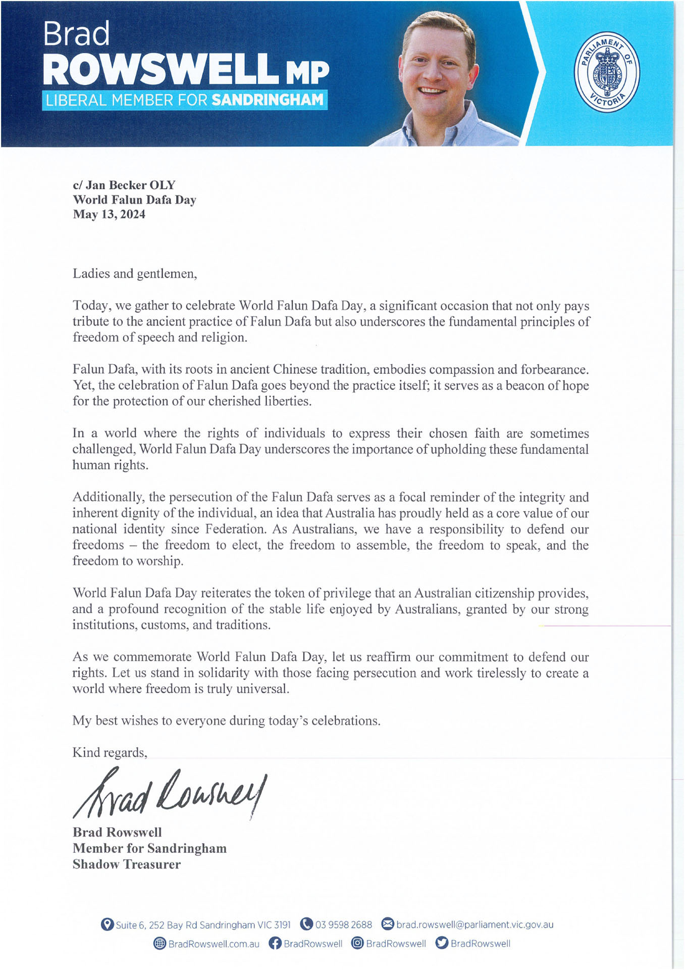维州影子内阁财长、桑德灵厄姆(Sandringham)选区州议员罗斯威尔(Brad Rowswell MP)在贺信中写道:“法轮大法源于中国古老传统,体现了善和忍的精神。然而,庆祝法轮大法的意义不仅仅在于修炼本身,他也是我们维护珍贵自由的希望之光。”