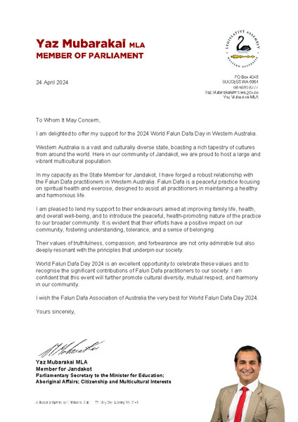 西澳洲詹达科特(Jandakot)区工党州议员亚兹·穆巴拉凯(Yaz Mubarakai)在支持信中说:“法轮大法真、善、忍的价值观不仅令人敬佩,而且与我们社会的根本 准则深深共鸣。