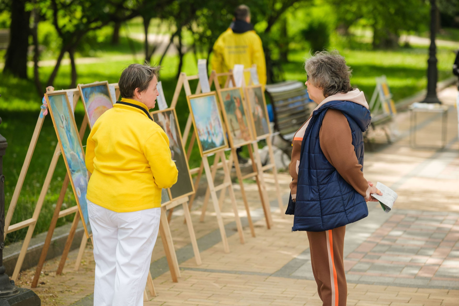 公园绿树成荫,风景如画,身穿明黄色上衣的法轮功学员向民众展示五套功法,还有的向路人发放资料,讲述法轮功真相。他们还陈列了一些真善忍国际艺术展的画作,这些作品全部由法轮功学员创作,展现出法轮大法的美好和修炼者的坚韧。