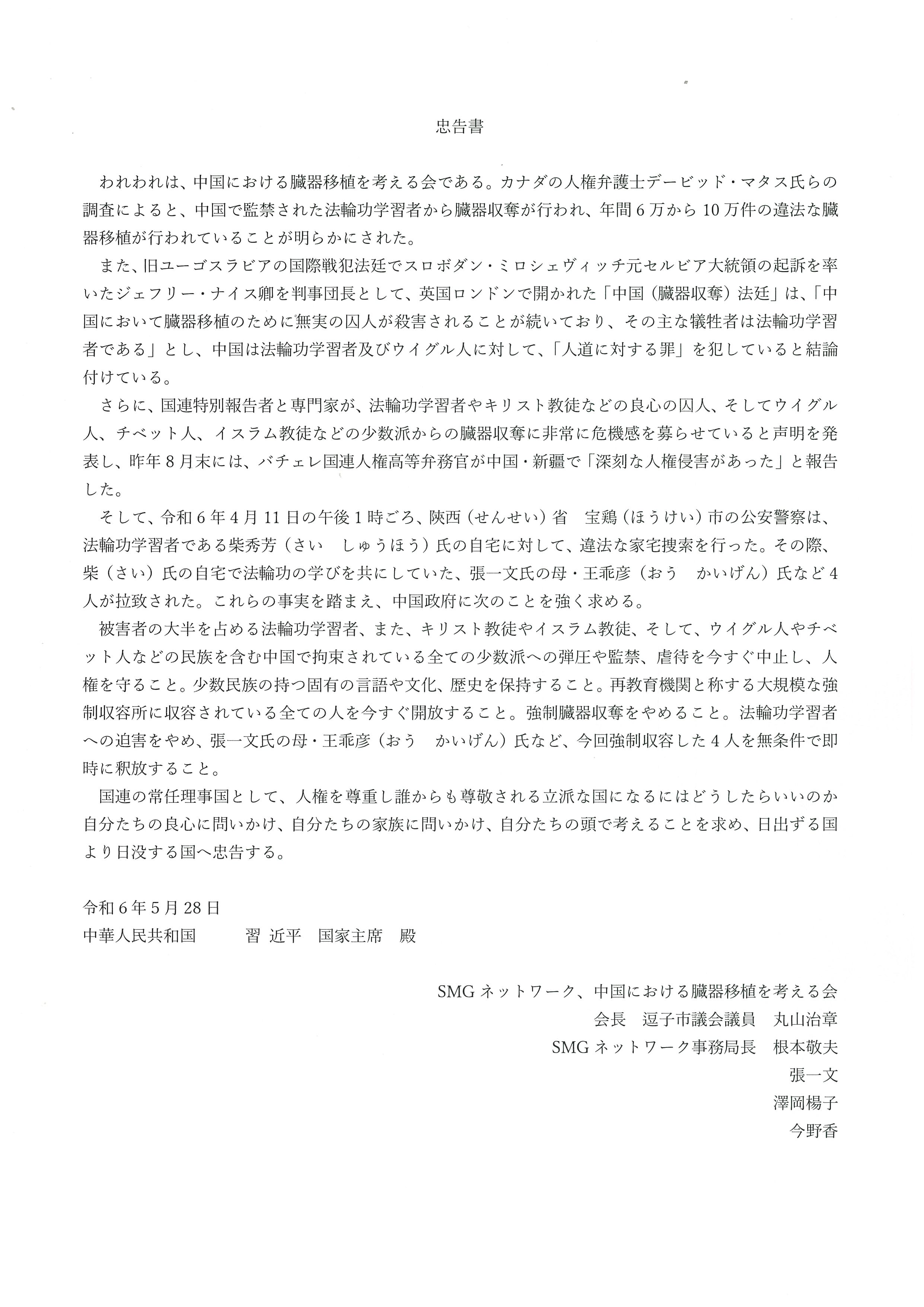 丸山治章先生在本次宣读的忠告书中,要求中共政府停止打压、监禁被迫害者,关闭强制收容所,停止活摘器官,同时呼吁立即释放包括日本法轮功学员张一文母亲王乖彦等本次被绑架的四名法轮功学员。