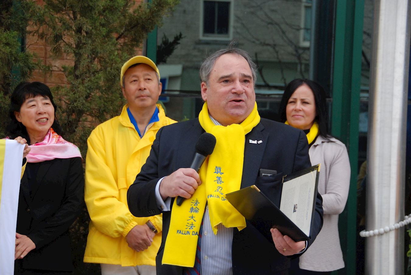 巴里市(Barrie)市长亚历克斯・纳托尔(Alex Nuttall)在升旗仪式上,与参与仪式的议员代表们高喊:“法轮大法好!”
