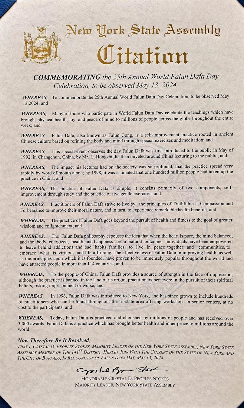 纽约州众议院多数党领袖克里斯特尔・皮普尔斯-斯托克斯(Crystal D. Peoples-Stokes)签发褒奖令,他表示:“李洪志先生的讲法对社会产生了轰动和深远的影响,法轮大法在人群中口耳相传迅速传播;到一九九八年,在中国估计有一亿人修炼法轮大法;法轮功是让全世界亿万人更健康、更和睦的功法。”