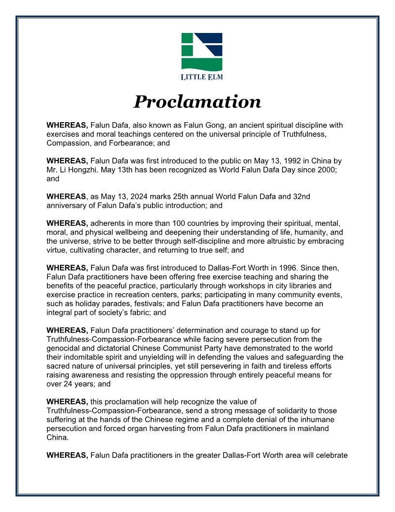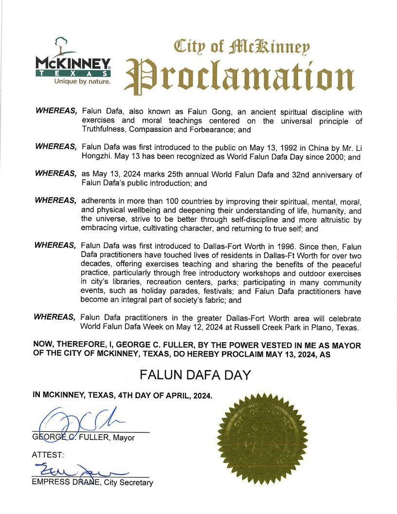 德克萨斯州达拉斯地区六个城市颁发褒奖,宣布这一天为自己城市的法轮大法日。