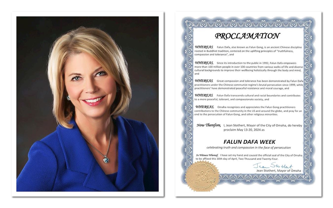 内布拉斯加州奥马哈市市长珍・斯托瑟特(Jean Stothert)颁发褒奖,宣布二零二四年五月十三日至五月二十日为“法轮大法周”。褒奖中说:“奥马哈市认可并感谢法轮功学员对美国和全球华人社区的贡献,并祈愿 (中共) 对法轮功和其他宗教少数群体的迫害早日结束。”