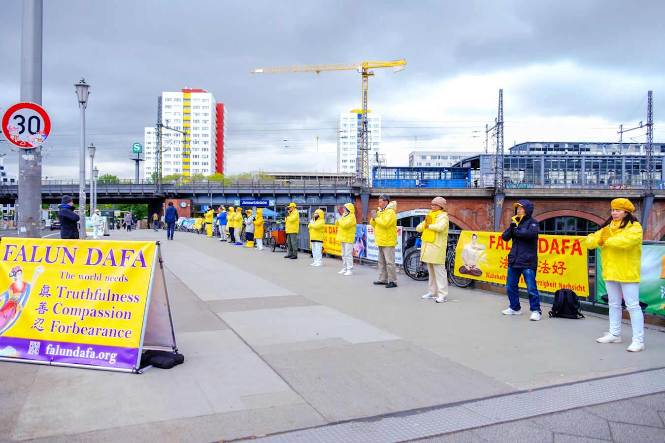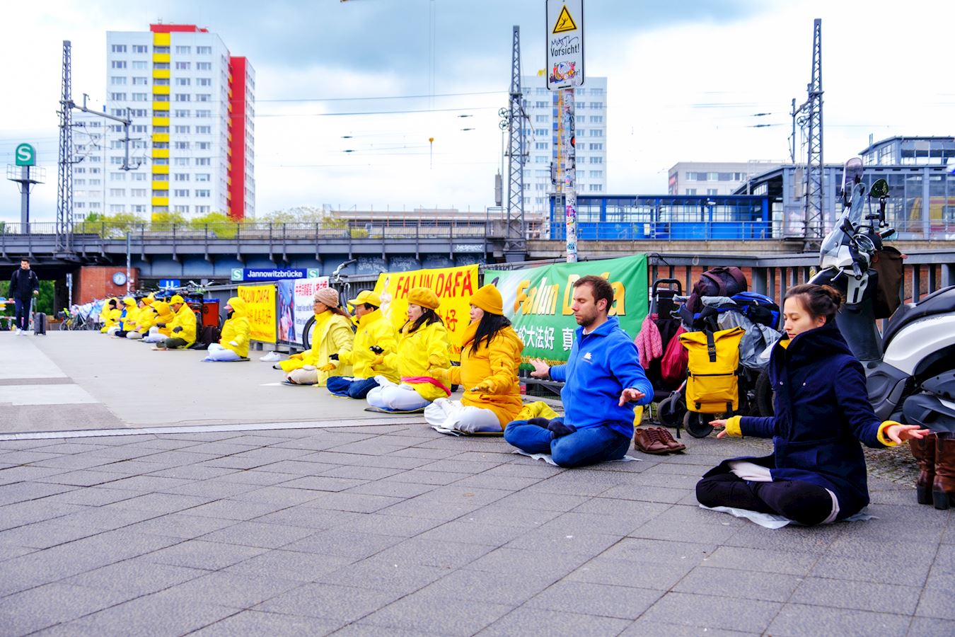 学员们在首都柏林中使馆对面亚诺维茨桥(Jannowitzbrücke)上举行纪念活动。伴随祥和的炼功音乐,法轮功学员向民众展示着法轮功五套功法,并向过往行人讲述中共迫害法轮功的真相,很多了解真相后的人们签名声援法轮功学员反迫害。