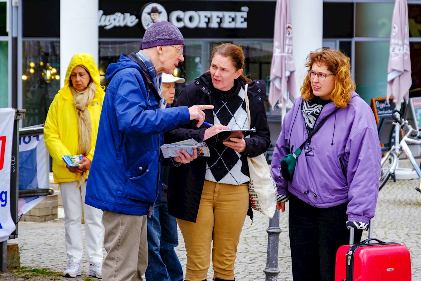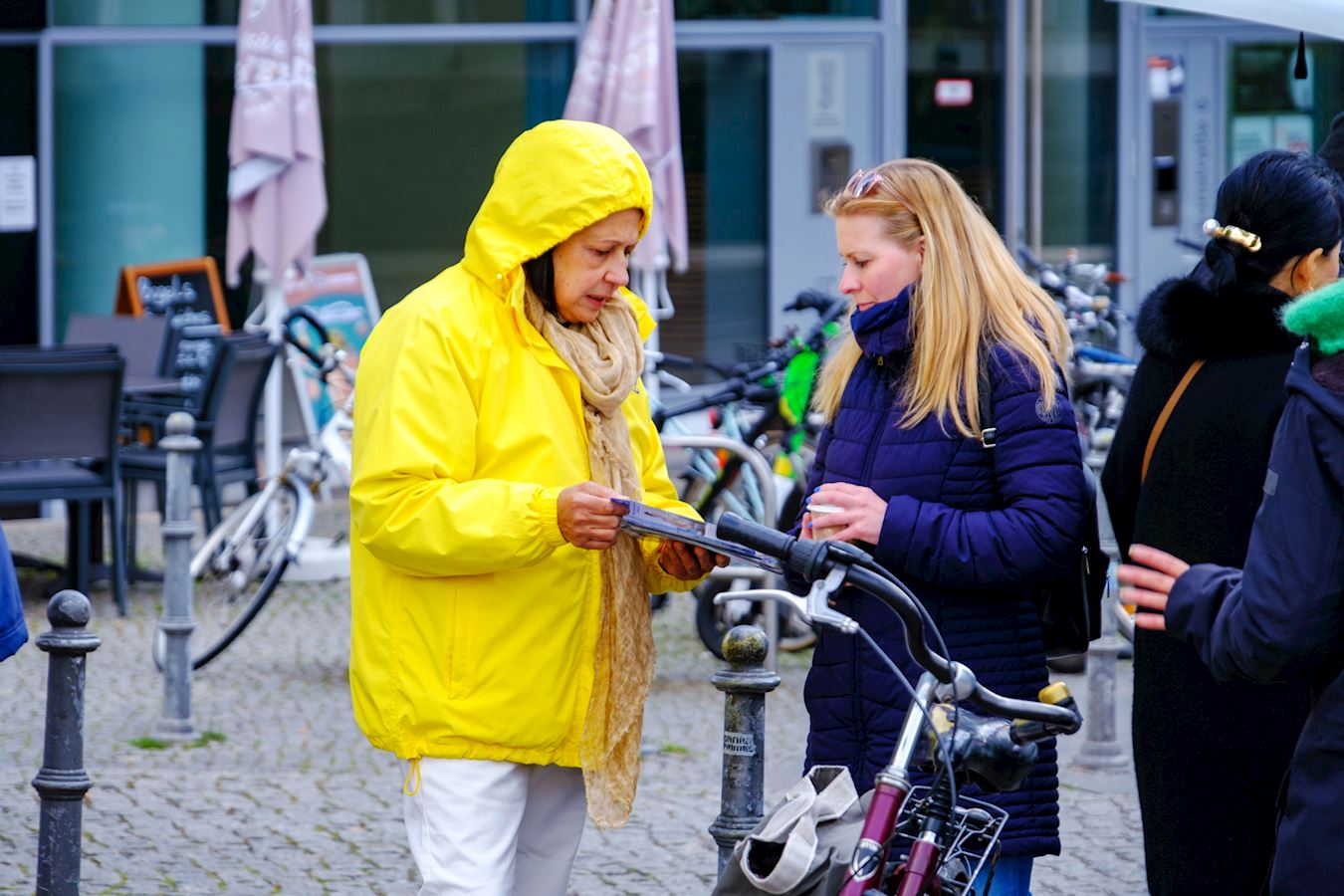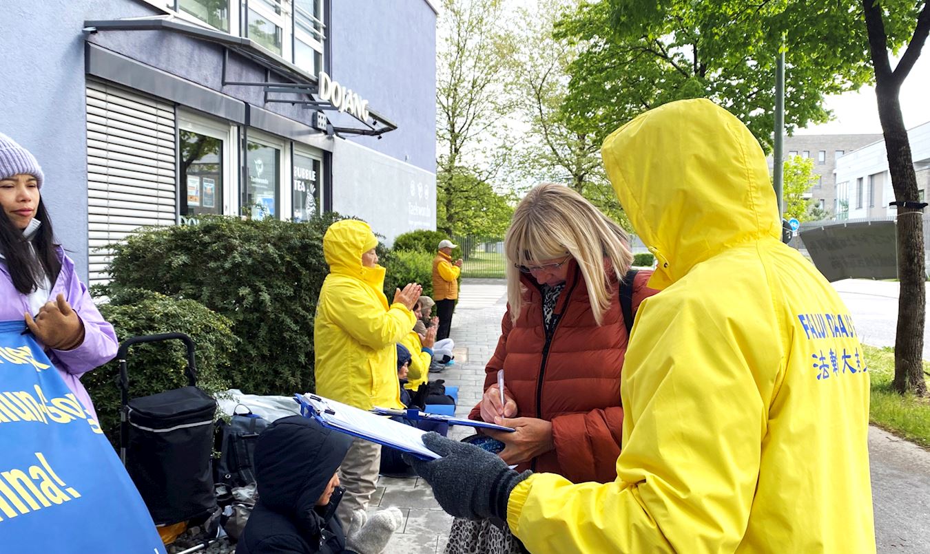 法轮功学员在南部巴伐利亚首府慕尼黑中领馆前举办纪念活动。住在附近的市场调查员卡门(Karmen)女士经常看到在中领馆前和平抗议的法轮功学员。这一天,她来到学员面前了解情况,然后签名声援法轮功学员反迫害。