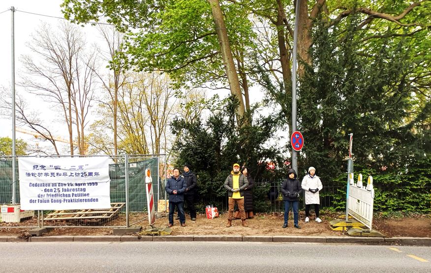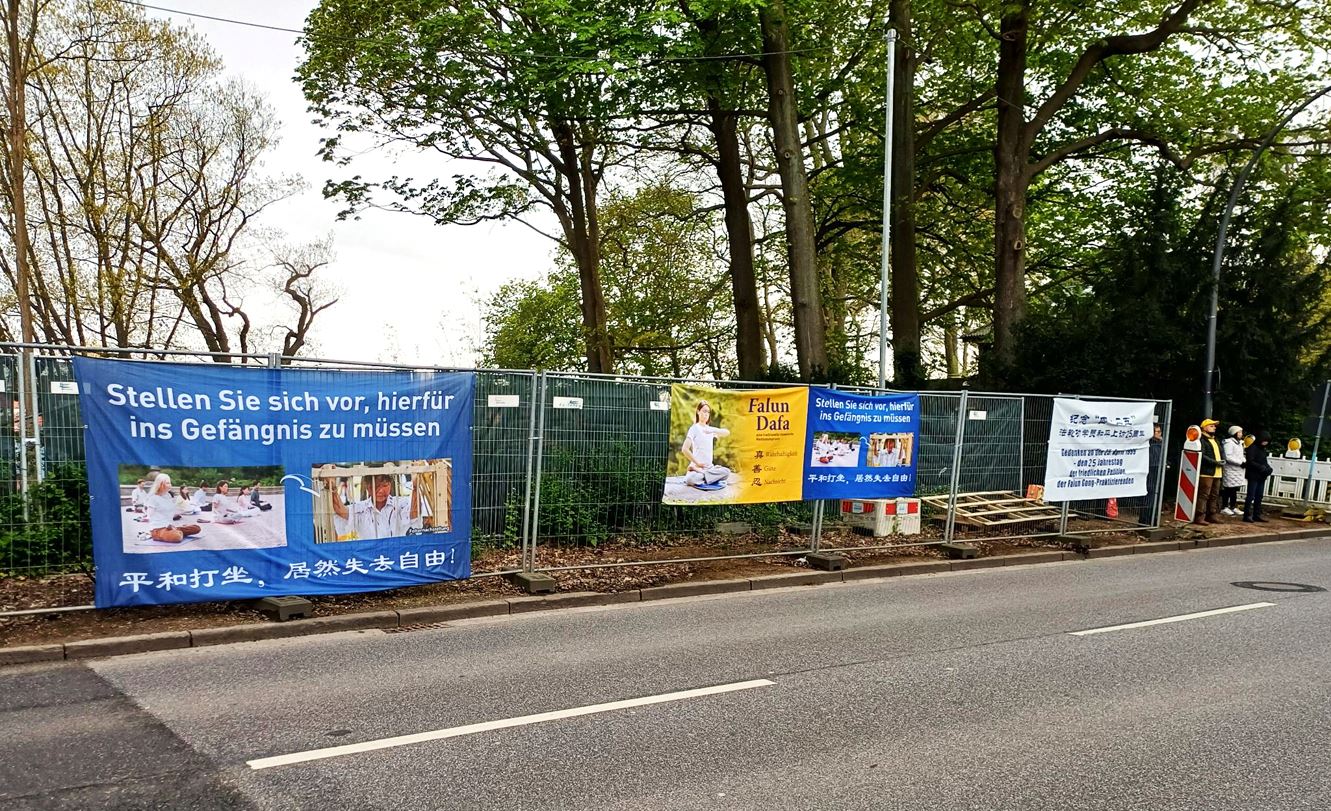 ![]() 图12~13:二零二四年四月二十五日,法轮功学员在德国汉堡中领馆前纪念四·二五和平上访二十五周年。 |