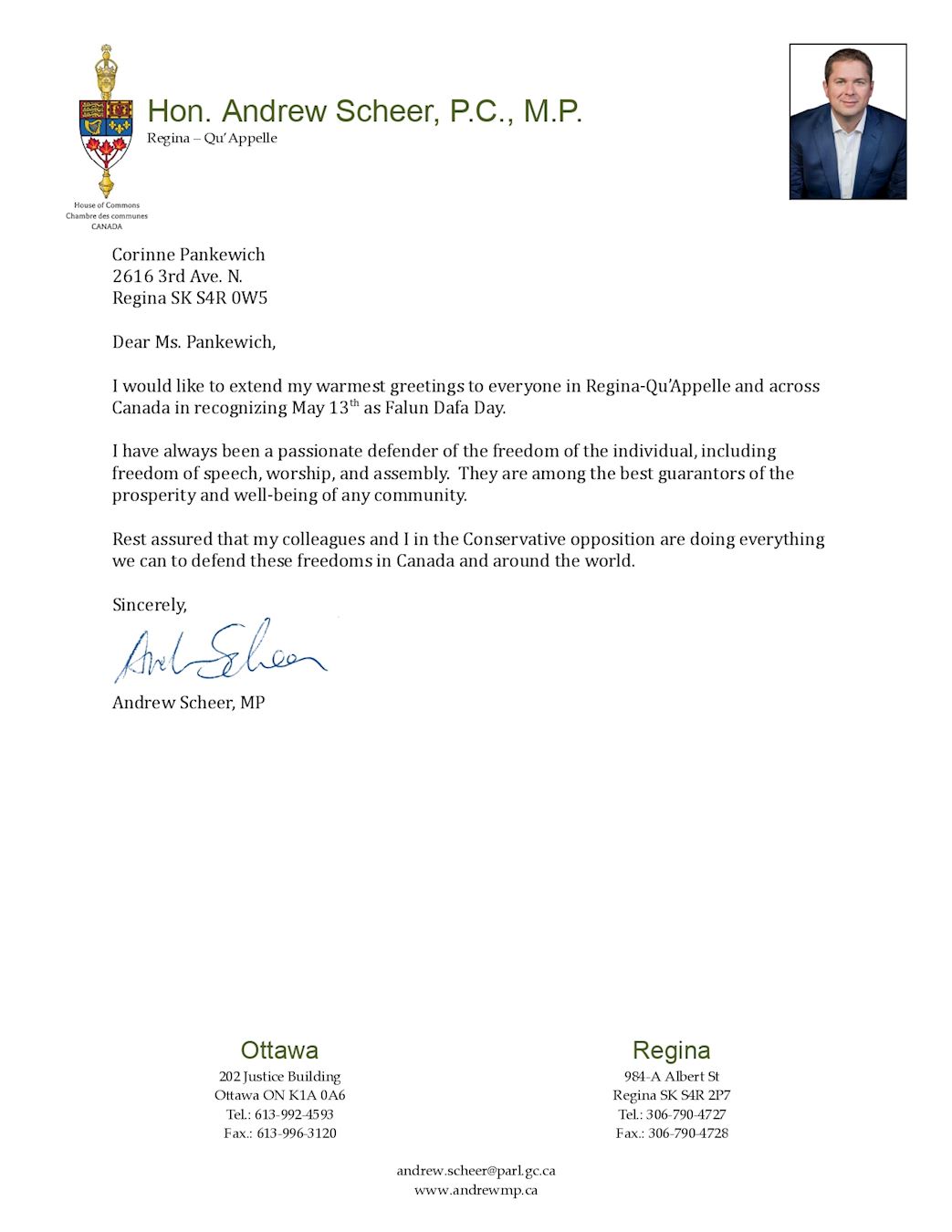 反对党议会领袖安德鲁·希尔(Andrew Scheer)在贺信中说:在五月十三日法轮大法日之际,我想对每一位里贾纳-卡佩尔(Regina-Qu’Appelle)选区及全加拿大的居民表达我最衷心的问候。