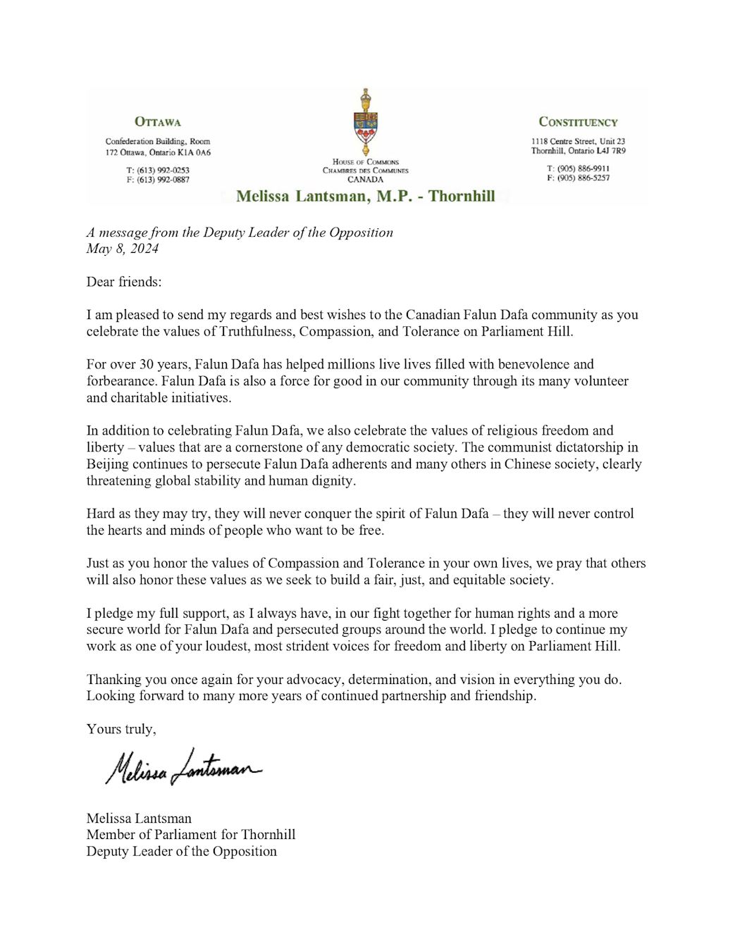 反对党副领袖梅丽莎·兰兹曼(Melissa Lantsman)在贺信中说:趁着你们来渥太华国会山庆祝“真、善、忍”的价值观,我很高兴向加拿大法轮大法团体致以最美好的问候和祝愿。