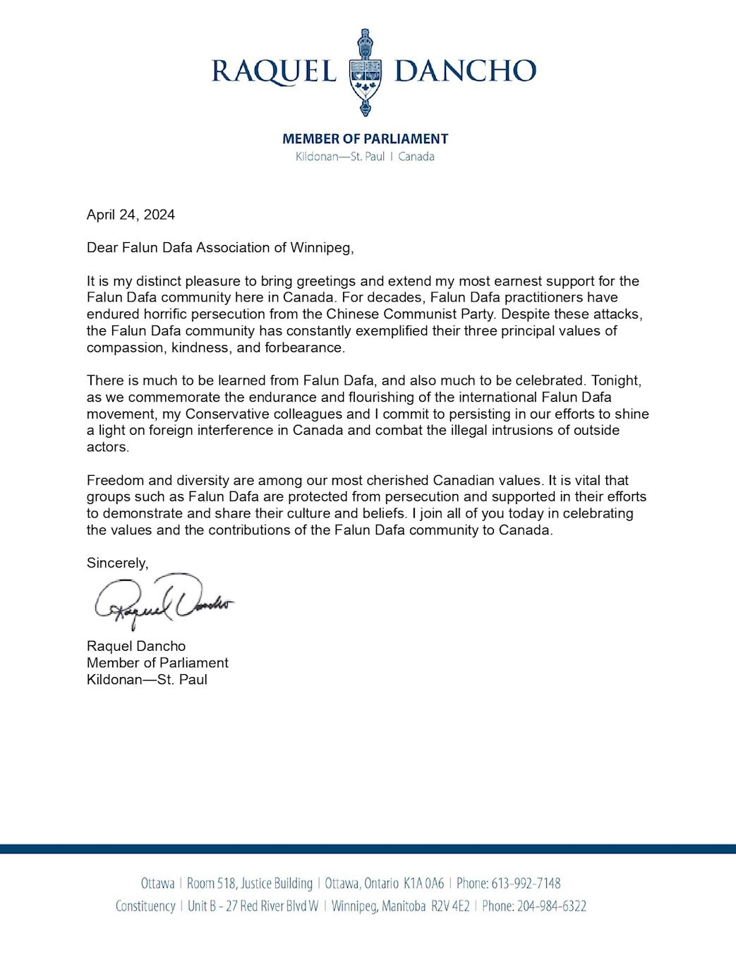 基尔多南-圣保罗选区国会议员蕾切尔·丹乔(Raquel Dancho)在贺信中说:我倍感荣幸能为加拿大法轮大法社区表达我衷心的支持及问候。在过去的几十年里,法轮大法学员承受了中国共产党残酷的迫害。尽管如此,法轮大法团体依然坚守例行他们的信念:真、善、忍。