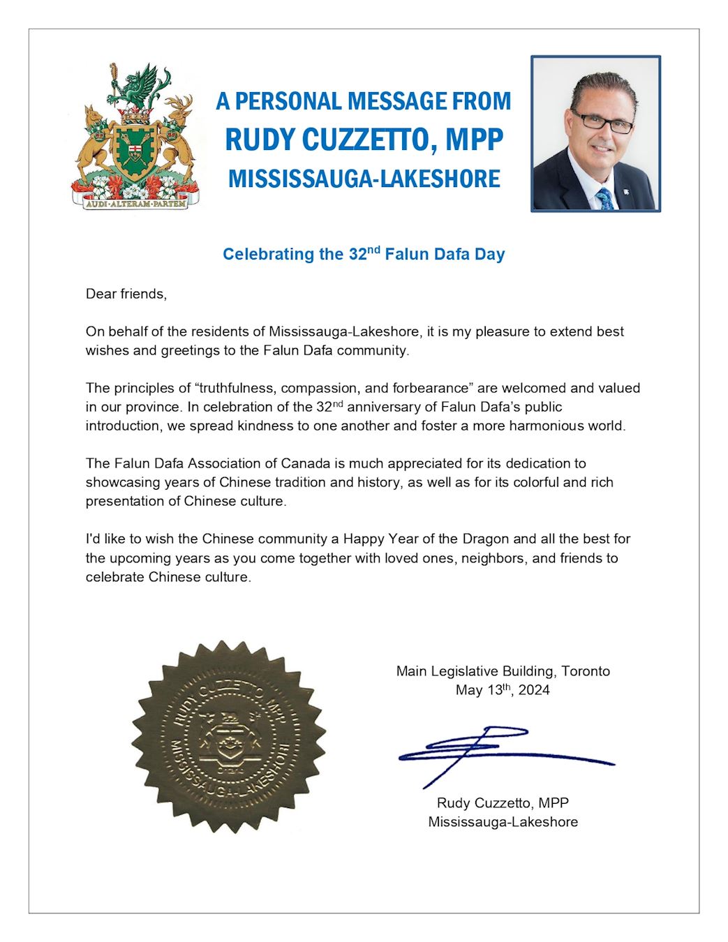 密西沙加市湖滨区省议员鲁迪·库泽托(Rudy Cuzzetto)在贺信中说:我很高兴代表密西沙加市湖滨区的居民们向你们致以最诚挚的谢意,并向法轮大法致以最美好的祝愿及问候。