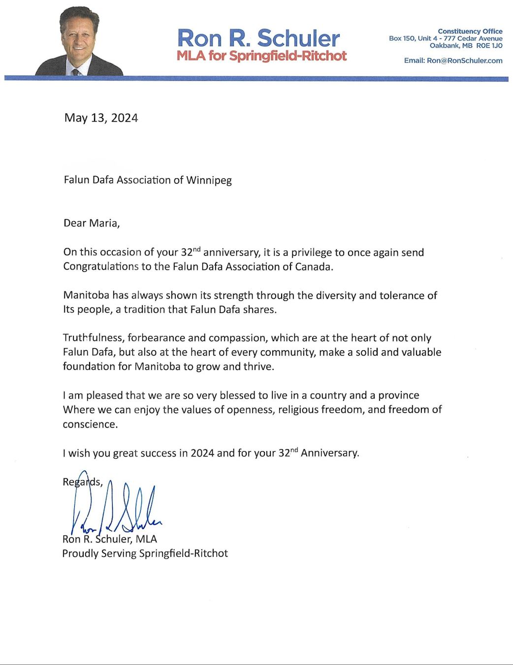 春田-里乔特区省议员罗恩·舒勒(Ron R. Schuler)在贺信中说:值此世界法轮大法弘传三十二周年之际,我荣幸地再次向加拿大法轮大法协会发出贺信。