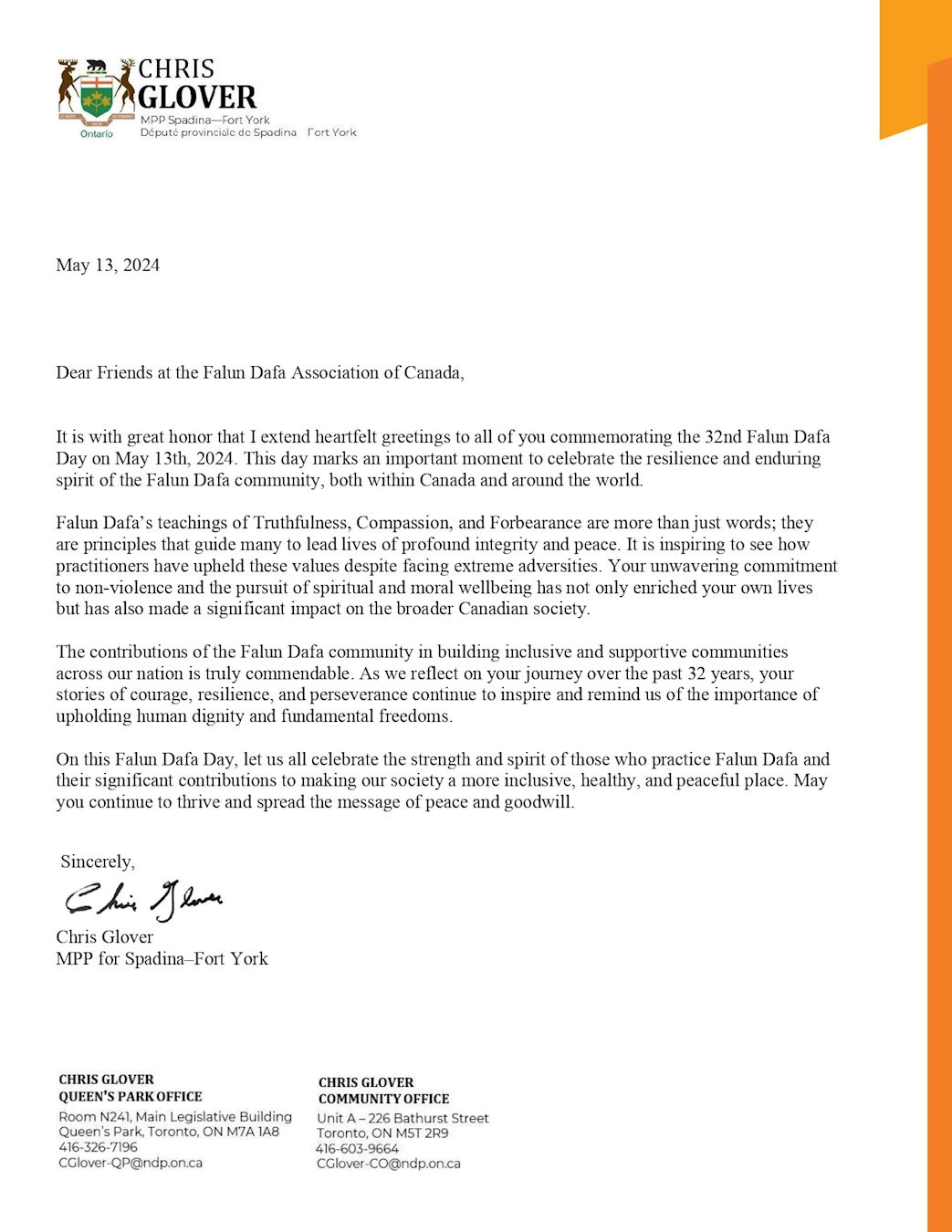 多伦多中区唐人街区省议员克里斯·格洛弗(Chris Glover)在贺信中说:值此纪念二零二四年五月十三日第三十二届法轮大法日之际,我谨向大家致以诚挚的问候。这一天是彰显加拿大和全世界法轮大法团体的坚韧不拔精神的重要时刻。