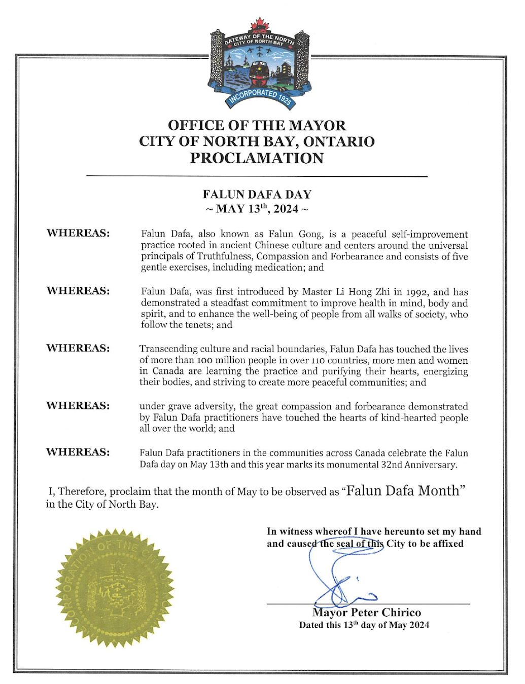 根据加拿大法轮大法协会在二零二四年四月四日递交的申请,宣布我市将于二零二四年五月十三日庆祝法轮大法弘传三十二周年的纪念日。