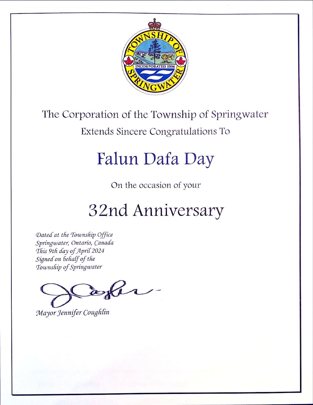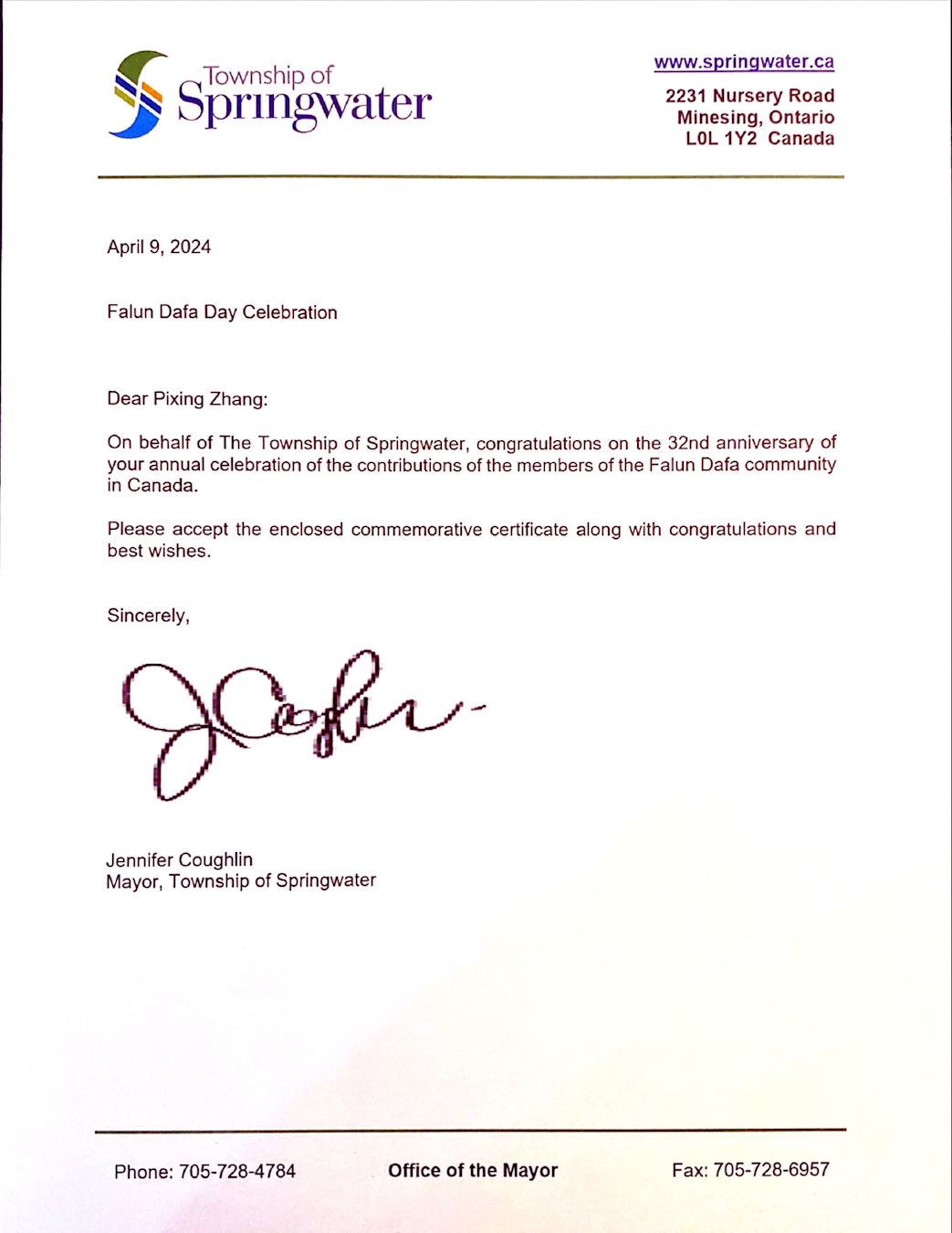 斯普林沃特镇长珍妮弗 • 考夫林(Jennifer Coughlin)在贺信说:我谨代表斯普林沃特镇祝贺法轮大法弘传三十二周年,以及加拿大法轮大法学员对小区做出的贡献。