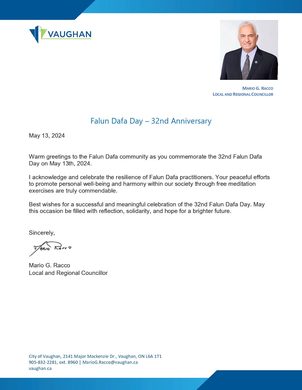 旺市市议员马立奥‧拉克(Mario G. Racco)在贺信中说:在庆祝法轮大法三十二周年之际,献上我温馨的祝福。