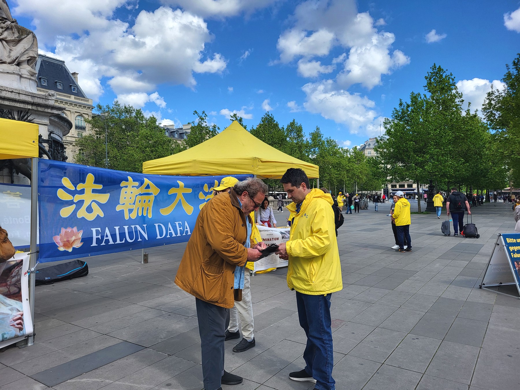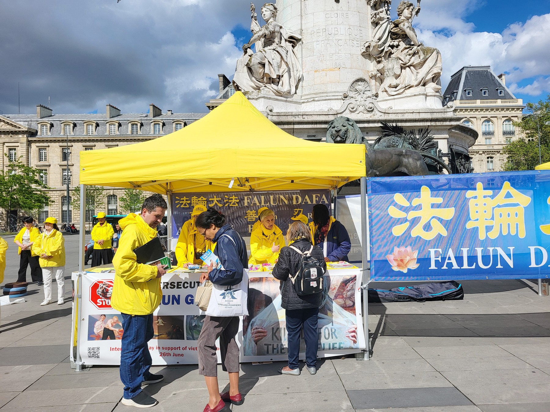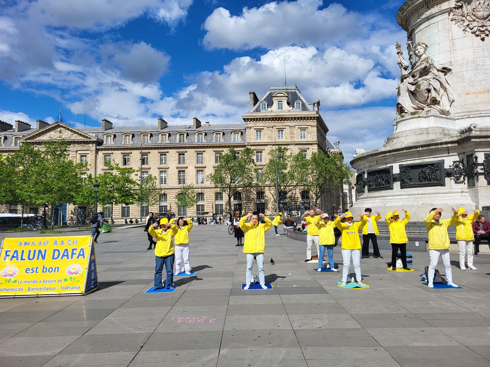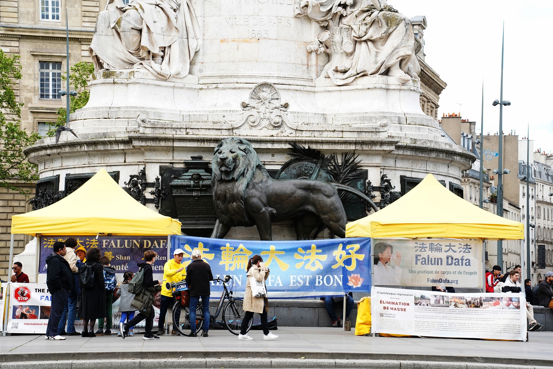时值中共党魁到访法国之时,法轮功学员在巴黎共和国广场向市民展示功法,传递法轮大法的美好,吸引路过的游客驻足观看,许多人前来关心,主动与学员交谈,在了解法轮功真相的同时,也表达了他们对法轮功的支持,纷纷在反迫害征签表上签名。伦敦人呼吁:“在中国不要共产主义,世界上任何地方都不要共产主义!”