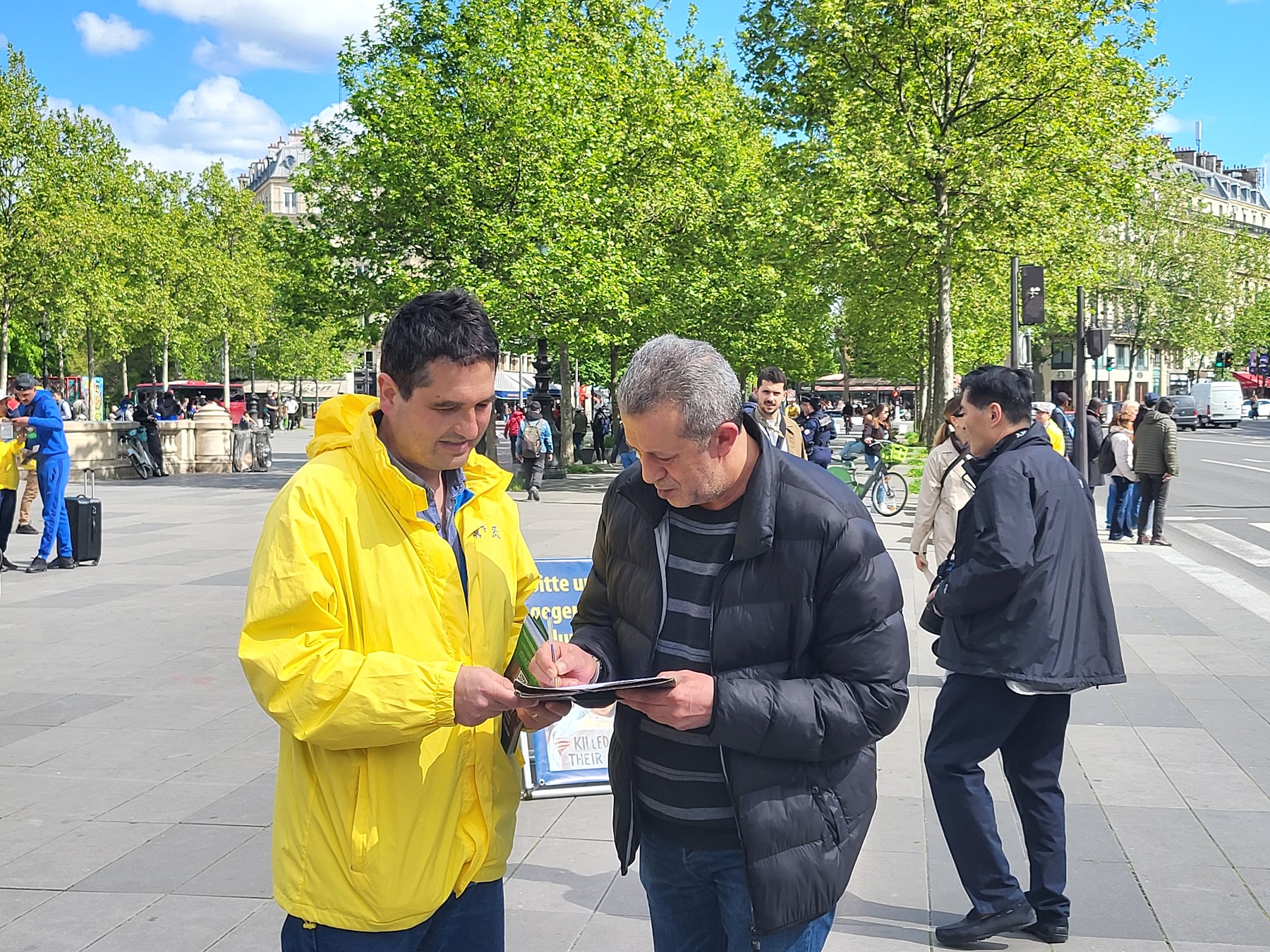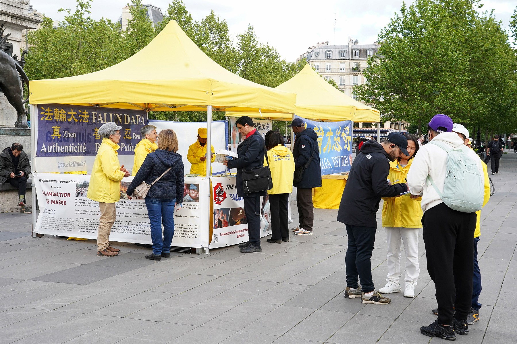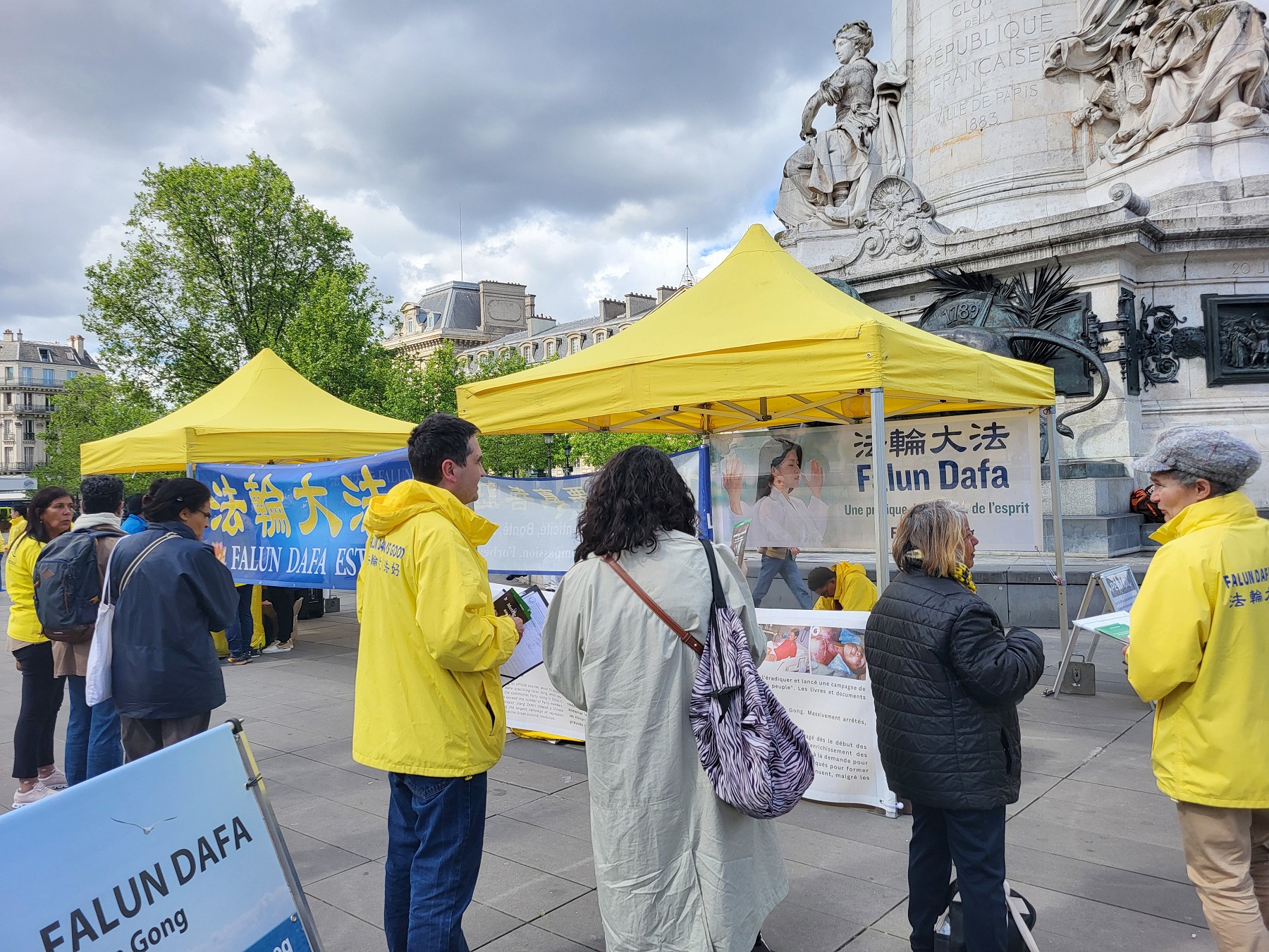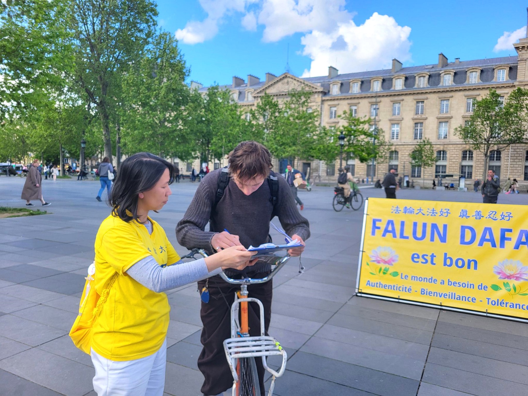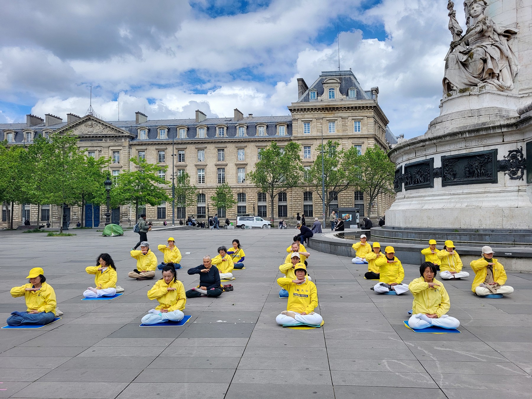 时值中共党魁到访法国之时,法轮功学员在巴黎共和国广场向市民展示功法,传递法轮大法的美好,吸引路过的游客驻足观看,许多人前来关心,主动与学员交谈,在了解法轮功真相的同时,也表达了他们对法轮功的支持,纷纷在反迫害征签表上签名。伦敦人呼吁:“在中国不要共产主义,世界上任何地方都不要共产主义!”