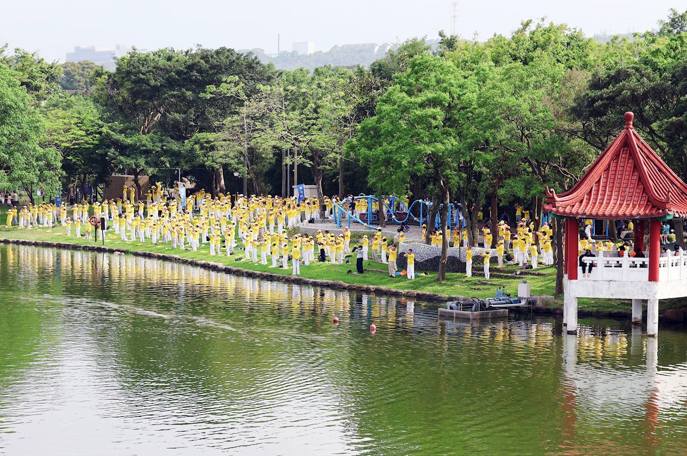 ![]() 图14~15:阳光和煦的午后,法轮功学员在龙潭大池池畔炼功,展现出祥和宁静的天人合一之美。 |
