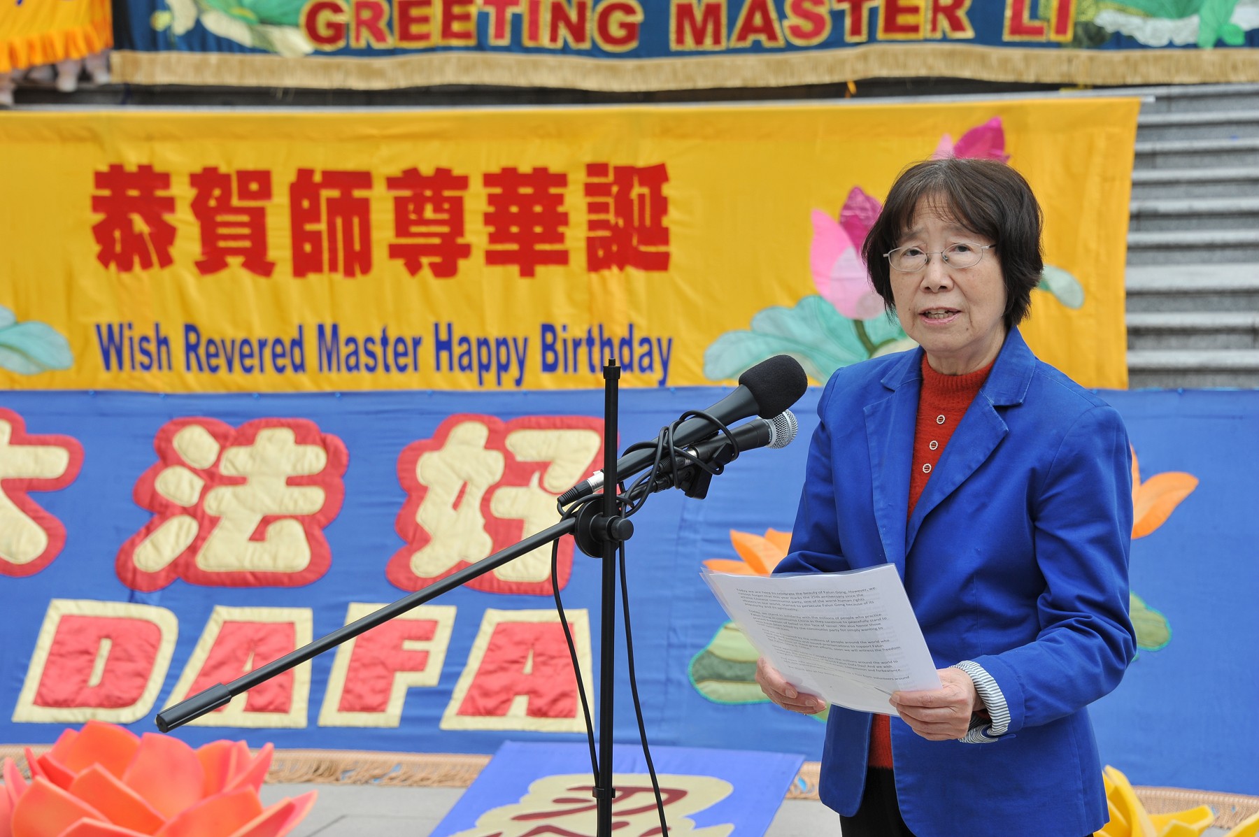 温哥华法轮大法学会发言人张素在庆典活动上致辞,她说:“李洪志先生将法轮功带给了中国民众。法轮功将共产主义之前已繁荣了五千年的传统文化带回中国。”