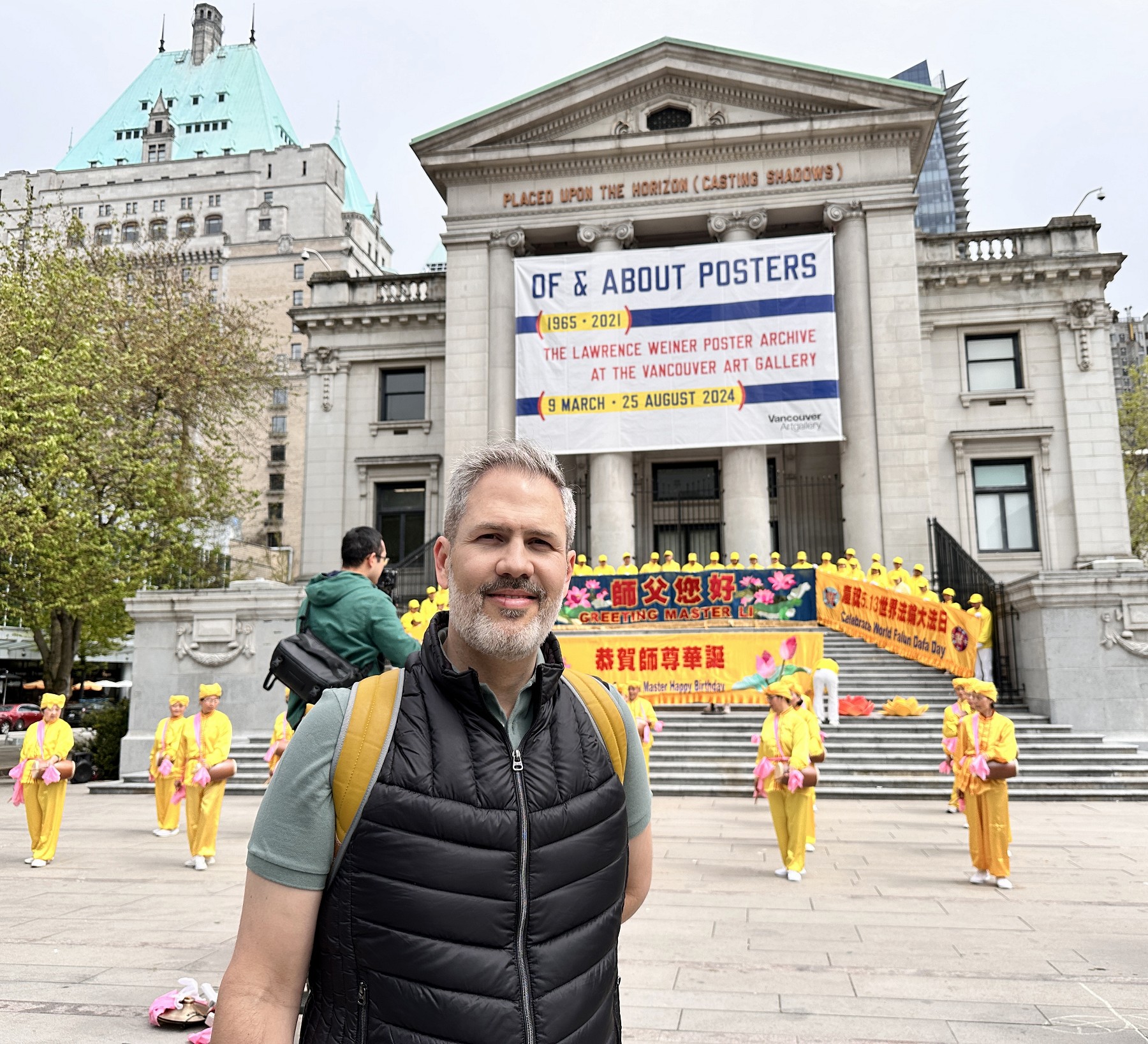 来温哥华旅游的墨西哥人劳尔(Raul),当天他从温哥华艺术馆前经过时,看到法轮功学员举办的庆祝活动,他说:“我很惊讶。首先,我没想到会在这里看到融入中国文化的表演。感到这里非常美,非常神奇,也让人感到非常宁静。”