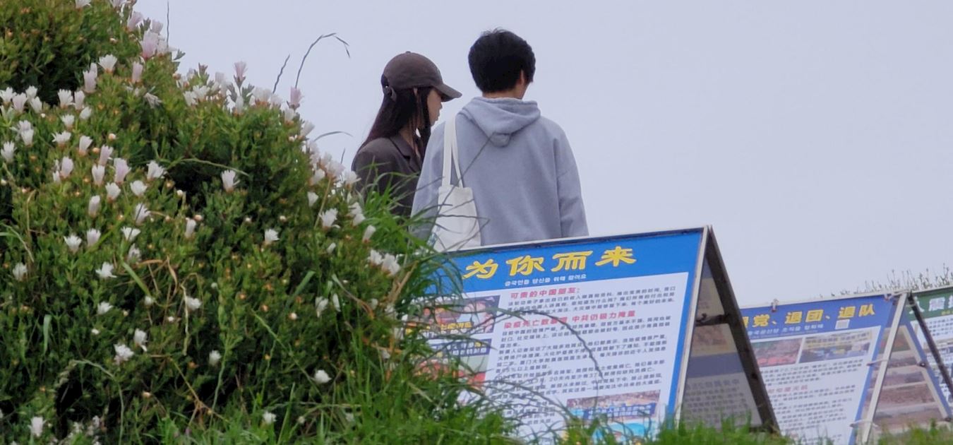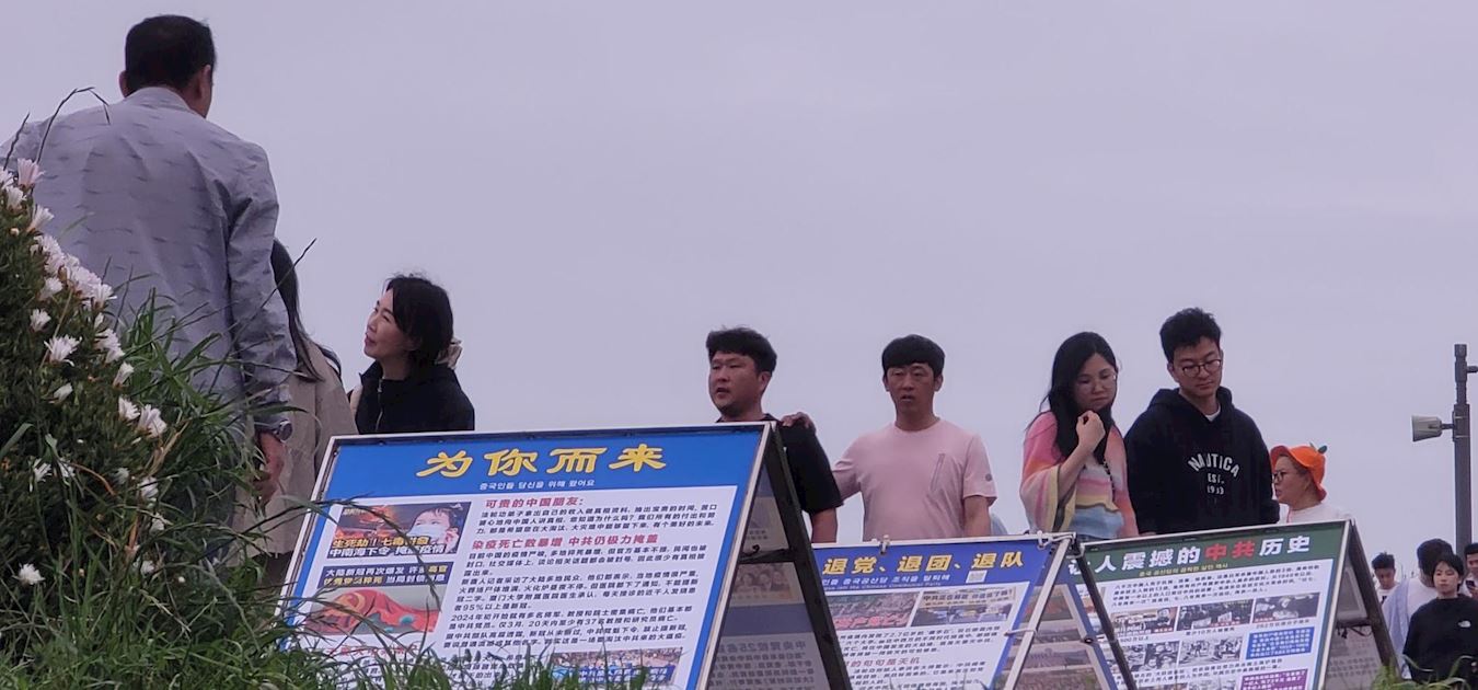 '图1~5:在济州岛新罗免税店真相展板前的中国游客,看到法轮功真相展板后他们震惊与意外,面对如此众多的中国游客,急缺讲中国话的同修讲真相,不说中国话的同修举展板、发资料、发正念也好啊。'