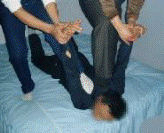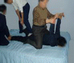 “推”就是骑在你的后背上,把你的胳膊画圆圈像划船式的推来推去,推到极限为止,推的骨缝直响;“掰”就是把你的两腿掰到极限,“掰”有时觉得不过瘾,再来个象撅猪肘子式的 “撅”:往前推倒背的双手,达到一百八十度;一人抓住一条小腿往前撅,同时往外掰。