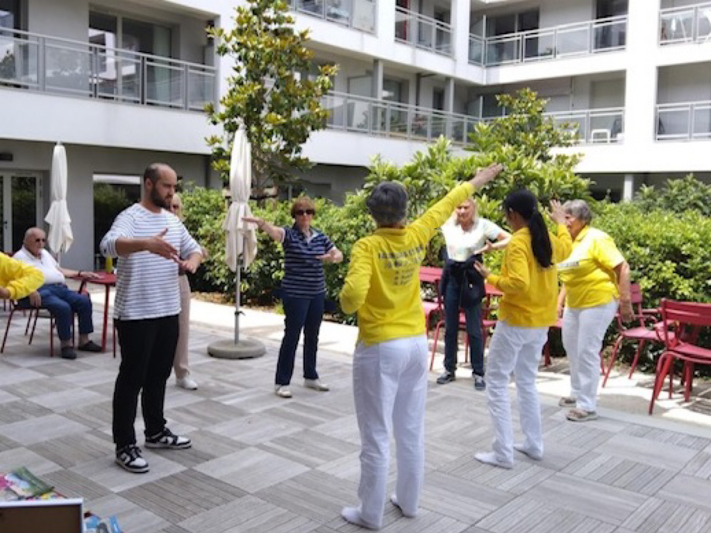 ![]() 图1~2:法轮功学员在法国西部拉罗谢尔(La Rochelle)的博索莱尔老人院(Villa Beausoleil)教法轮功功法。 |