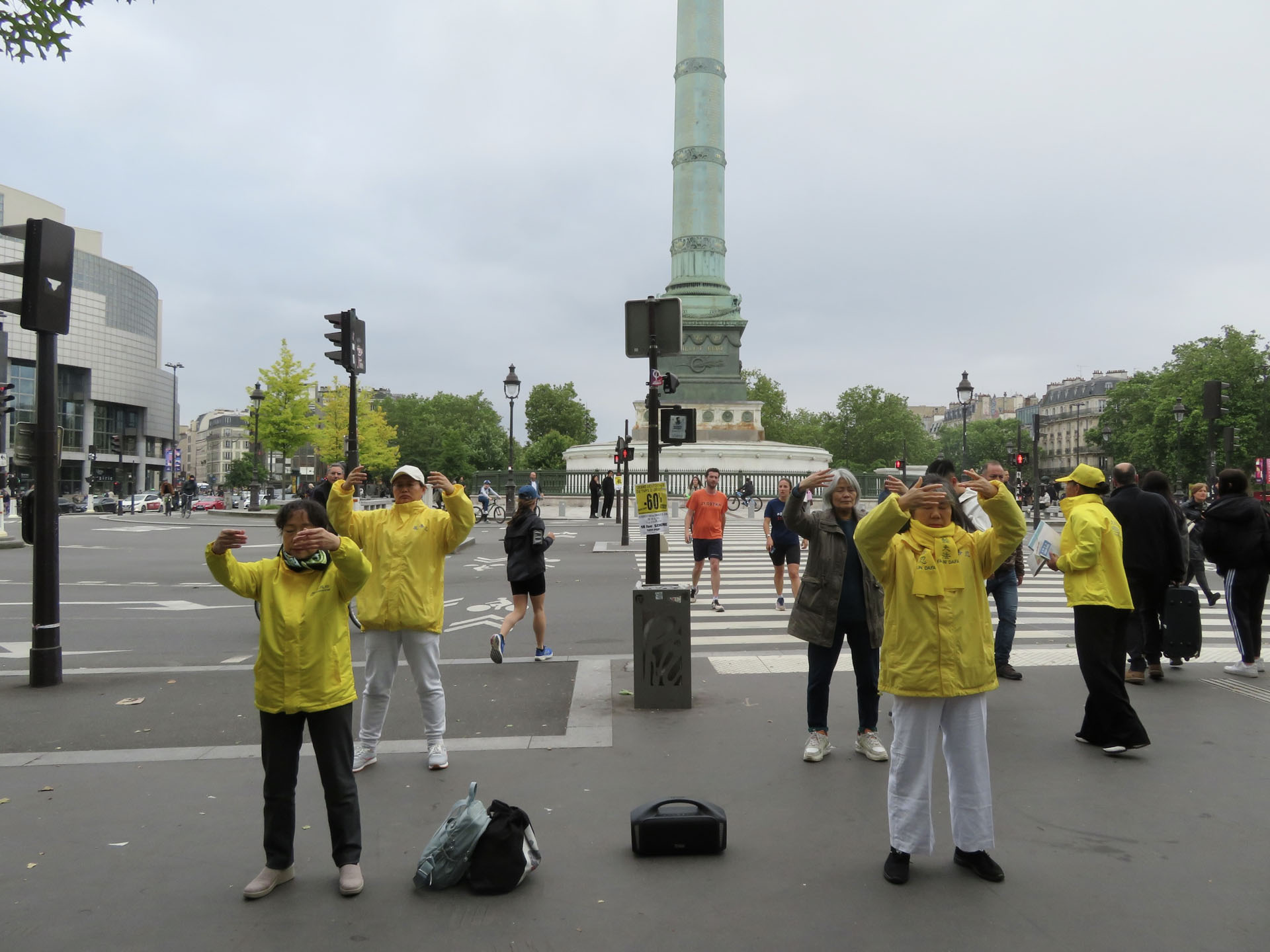 ![]() 图1~2:二零二四年六月二日和九日,连续两个星期天的上午,法轮功学员在巴黎巴士底广场(Place de Bastille)进行了炼功、讲真相的活动。 |