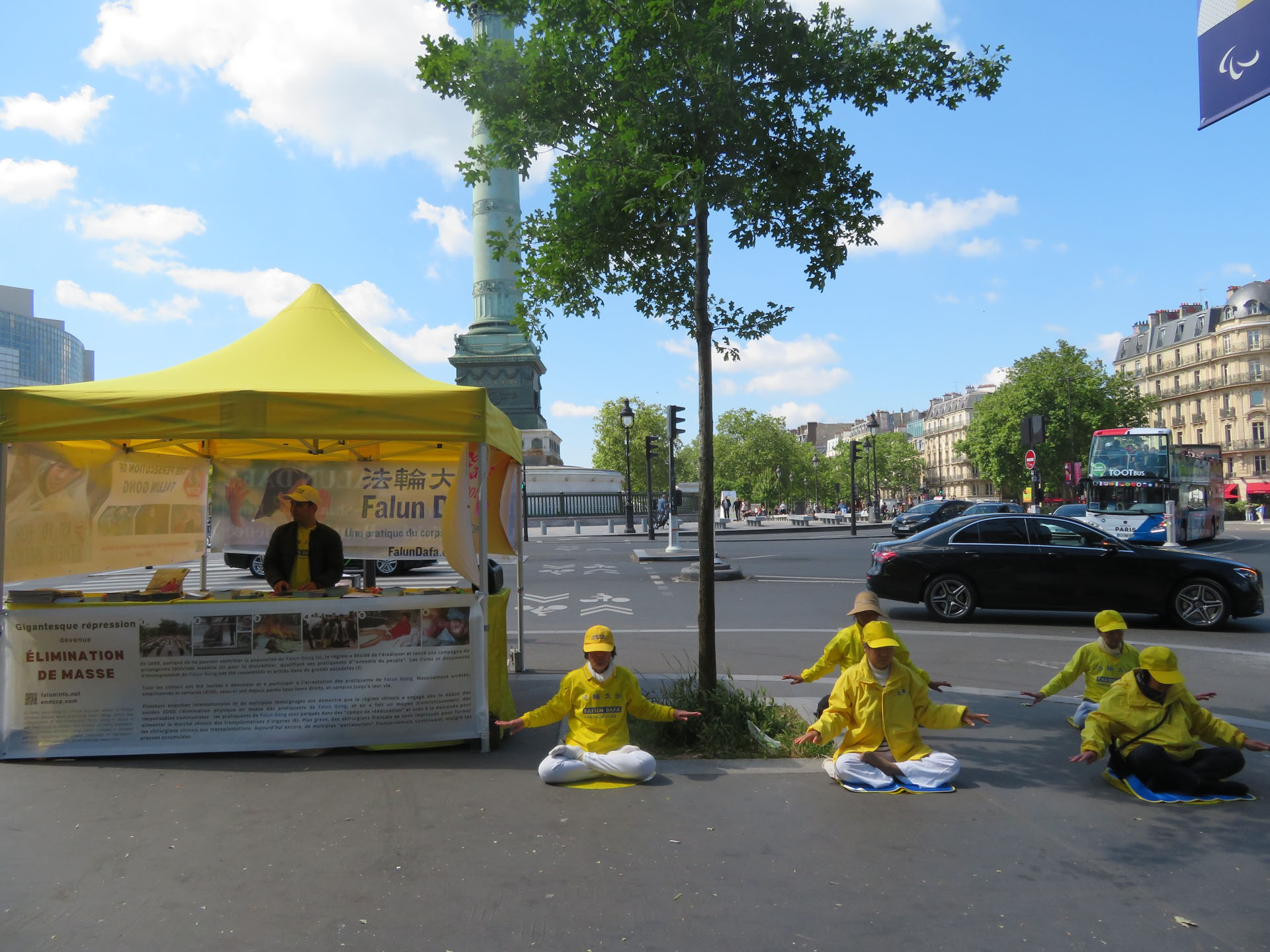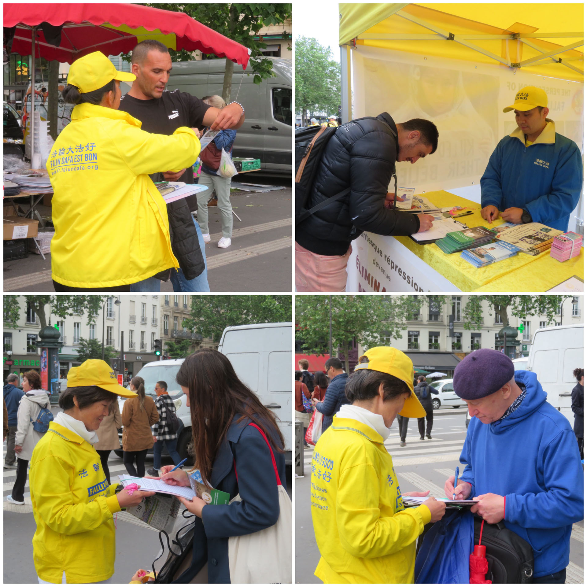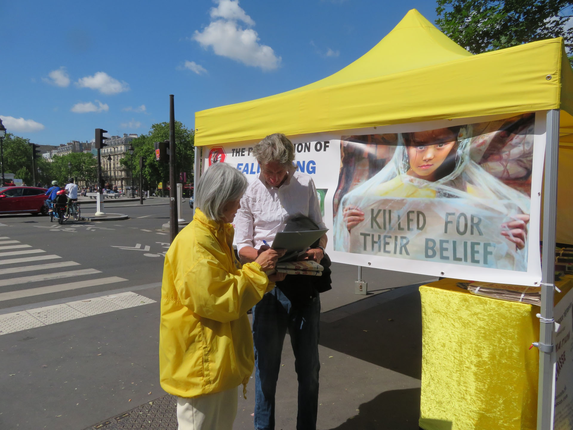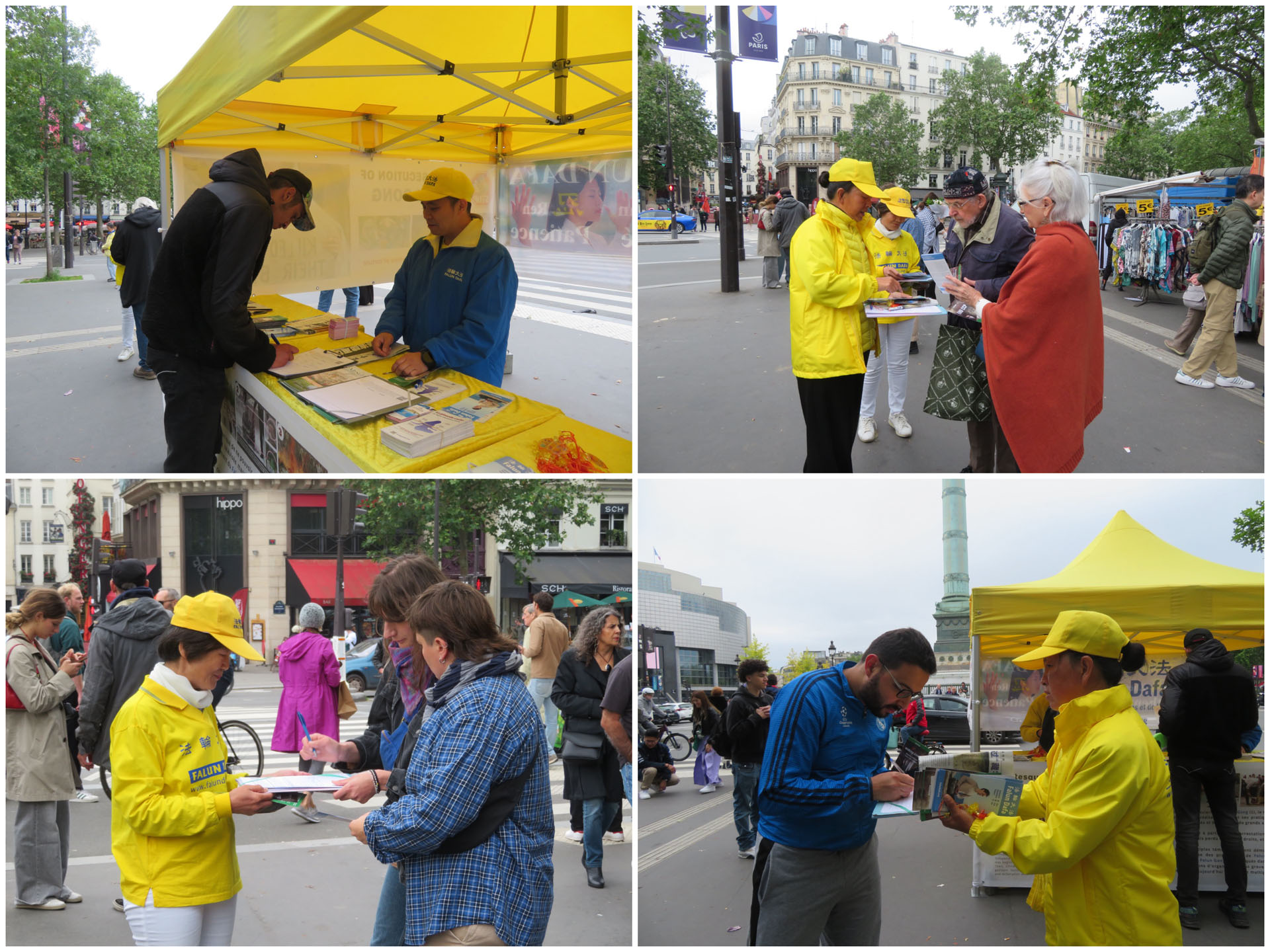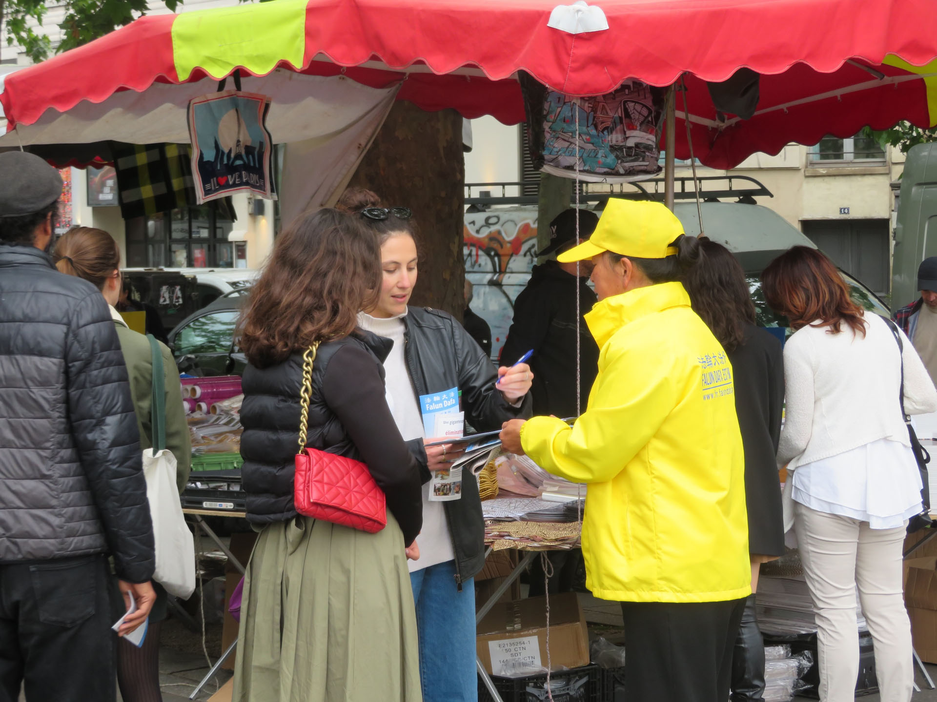 巴黎市民和游客在前往巴士底广场旁早市买菜时,路过法轮功学员的信息台,法轮功学员舒缓的炼功动作,祥和的炼功音乐,吸引了路人驻足观看。人们在了解法轮功真相后,纷纷在反迫害征签表上签字,愿为停止迫害助一臂之力。