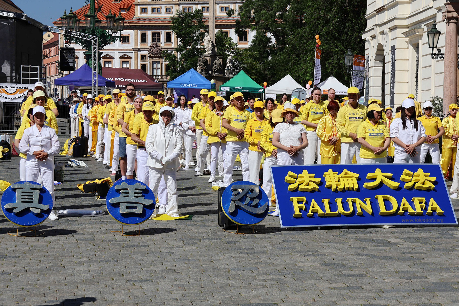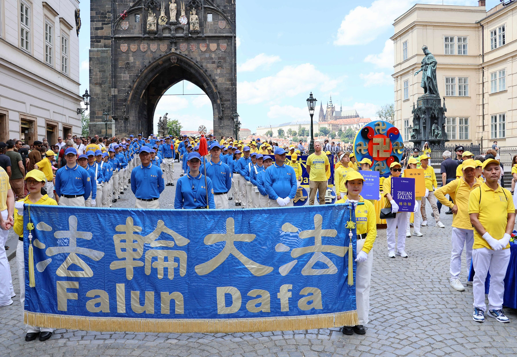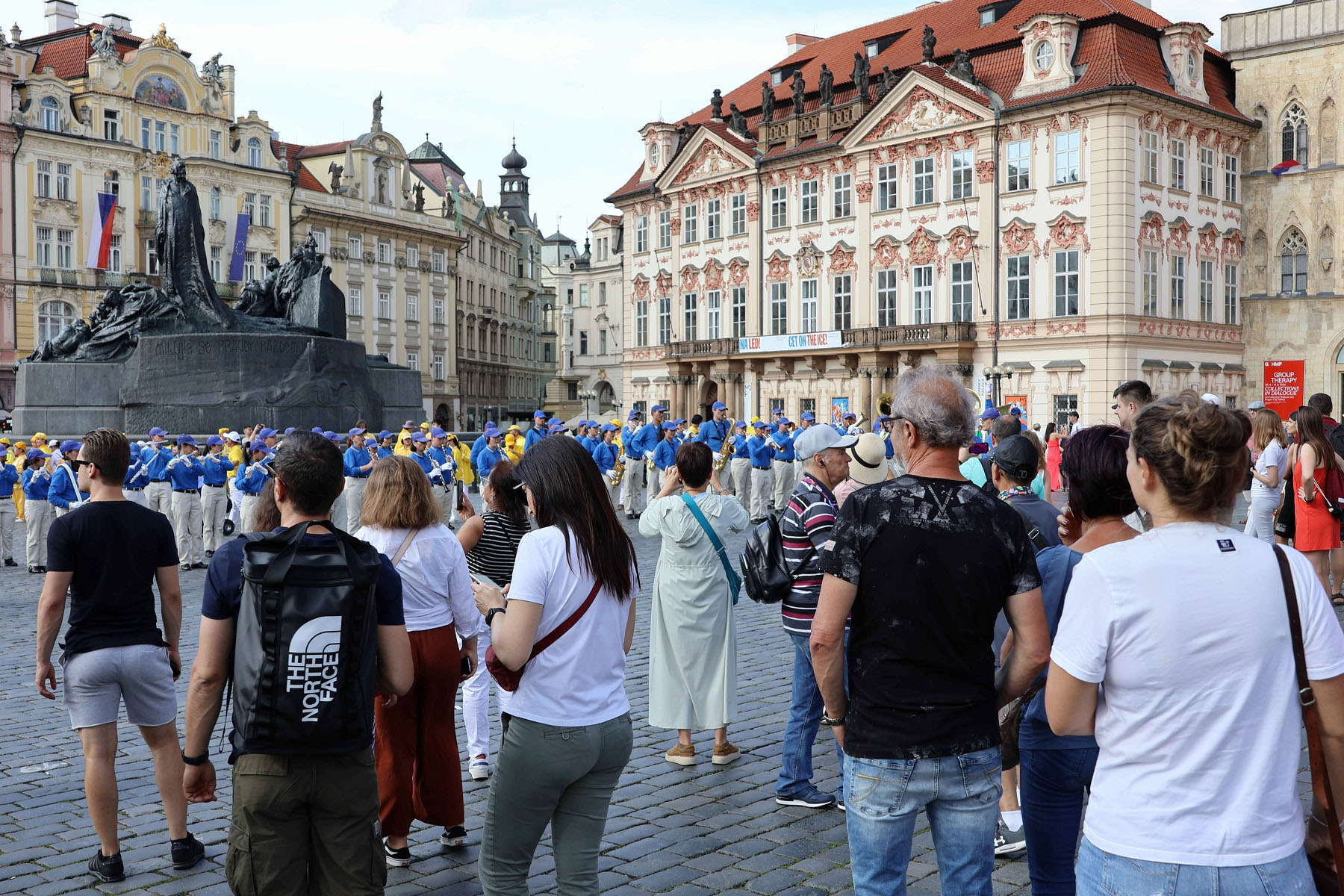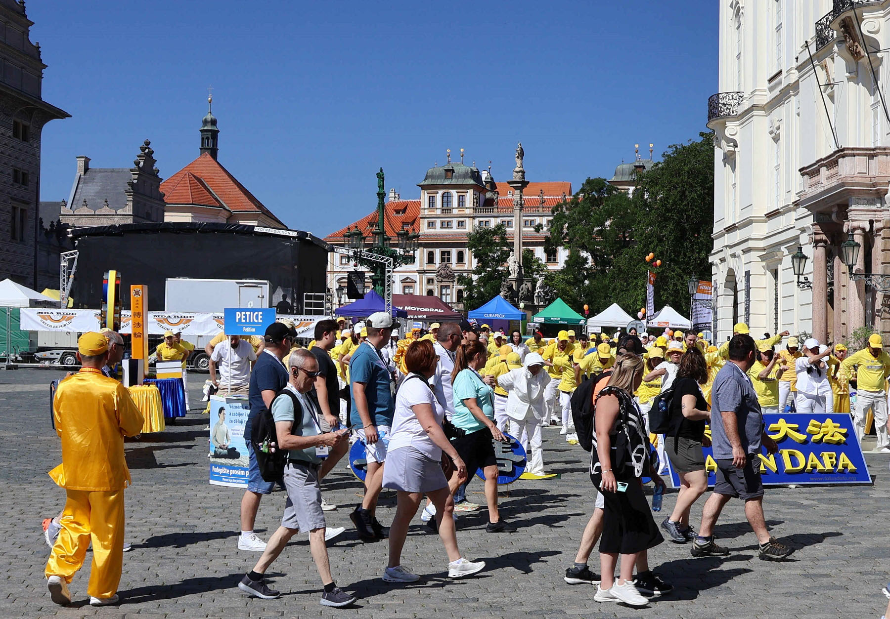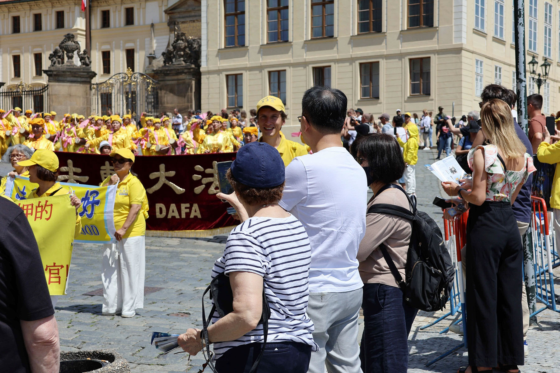 六月八日,适逢阳光灿烂的周六,布拉格城堡广场(Hradcany Square)再度涌现熙熙攘攘的人群,或参观城堡,或观看换岗,或参加当日的集会。在嘈杂中,一群身着黄衣的法轮大法修炼者微闭双目,随着悠扬的音乐声做着缓慢柔和的动作,与周围的喧闹形成对比。