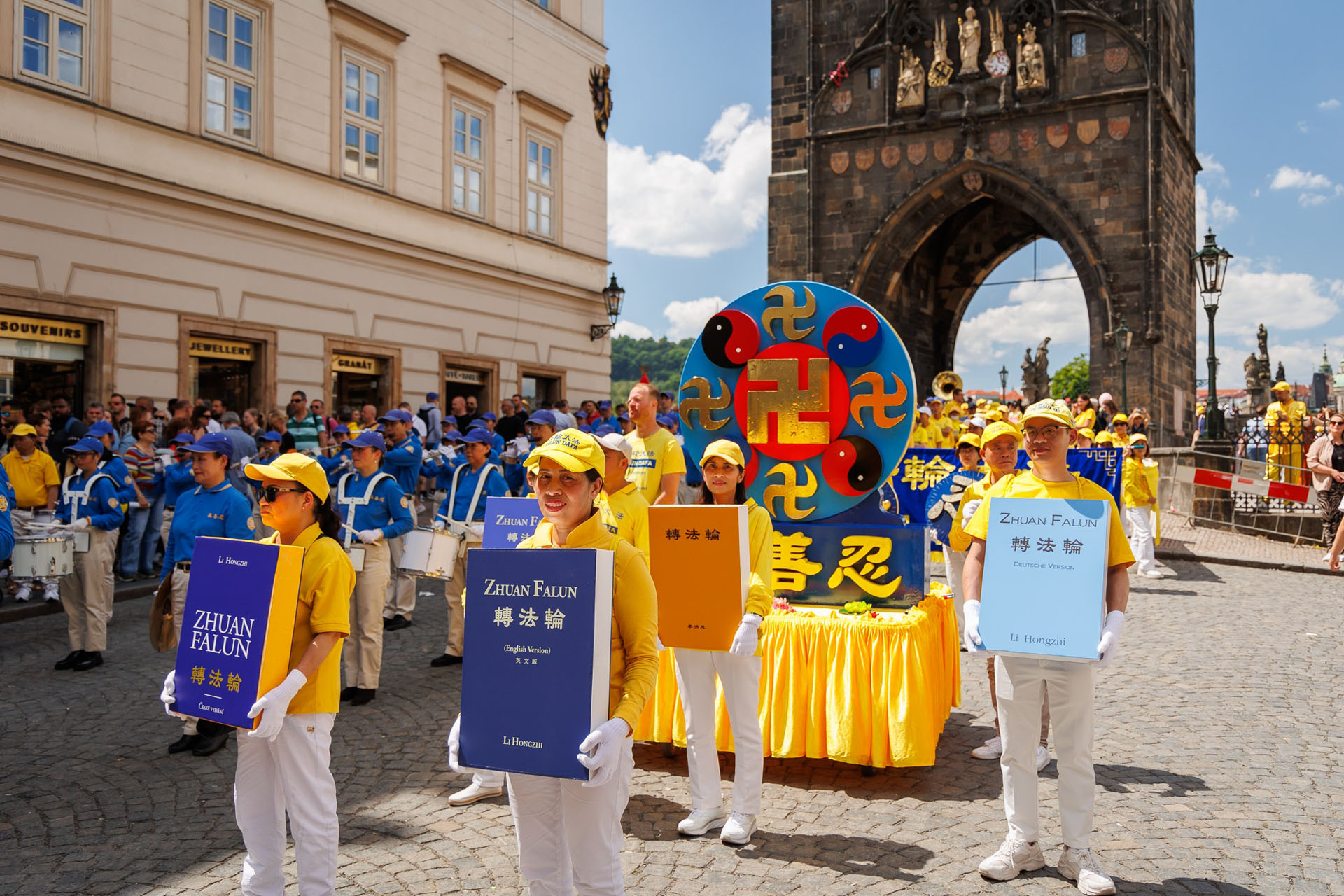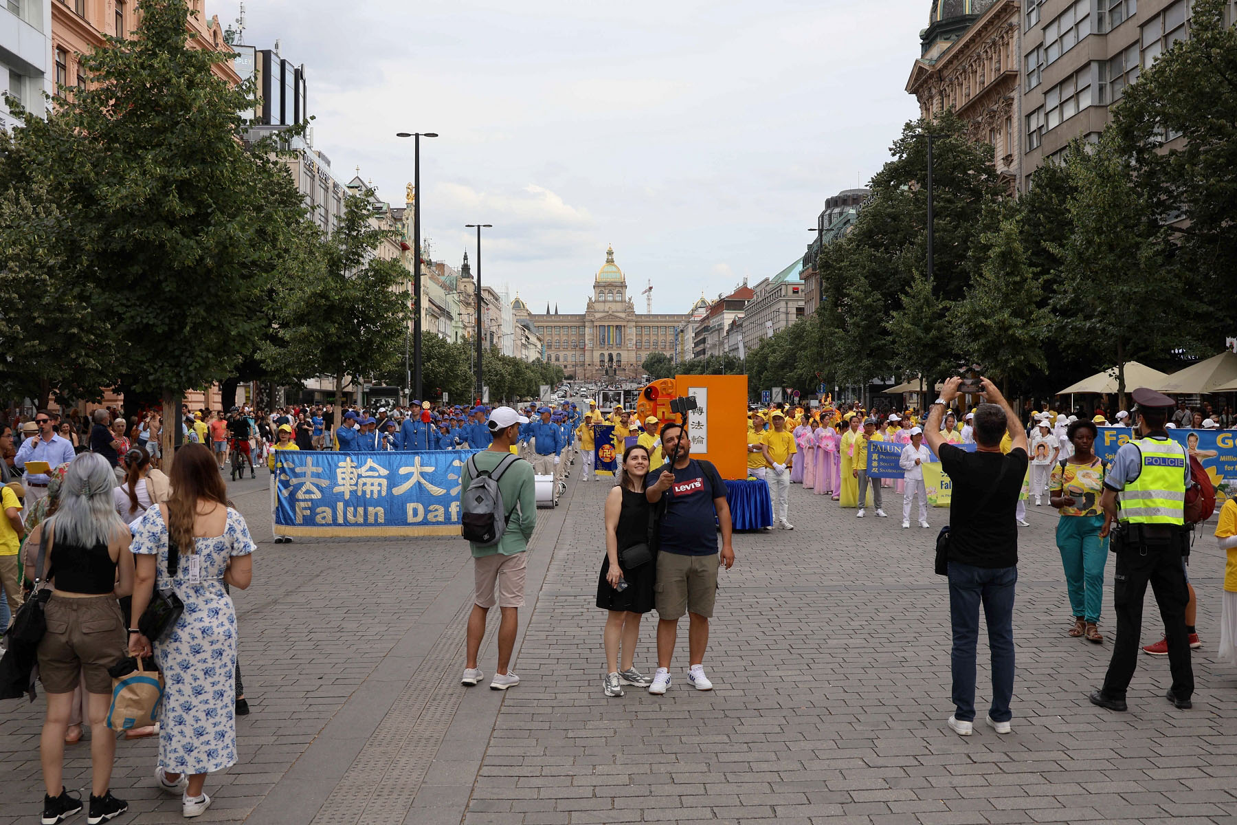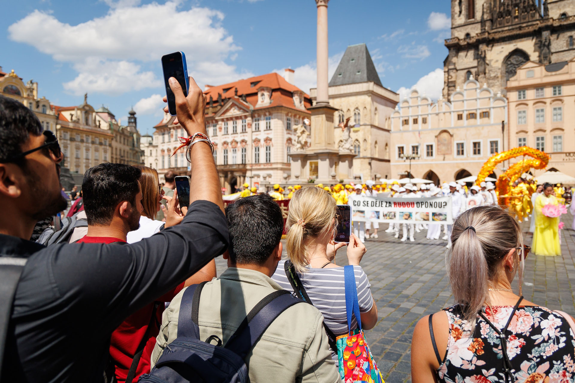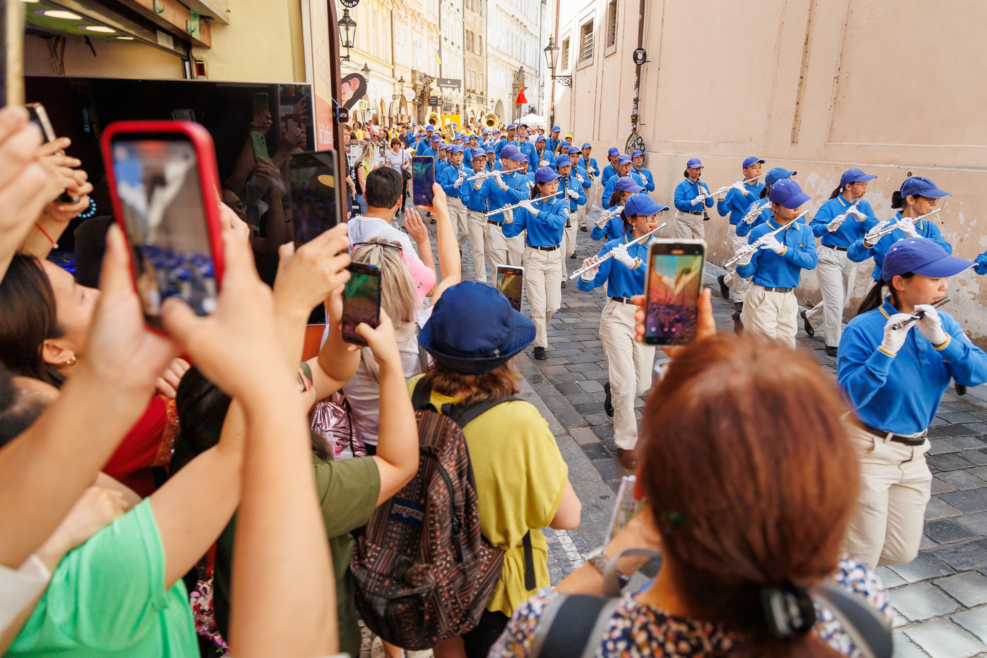 这支独特的游行队伍,向游客展示了布拉格的独特风景,传递了前所未闻的全新讯息。有的游客特意与炼功的学员、天国乐团军乐队、巨型的《转法轮》模型及金色的真、善、忍横幅合影留念。