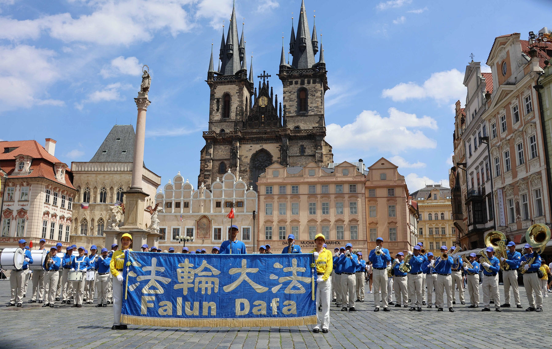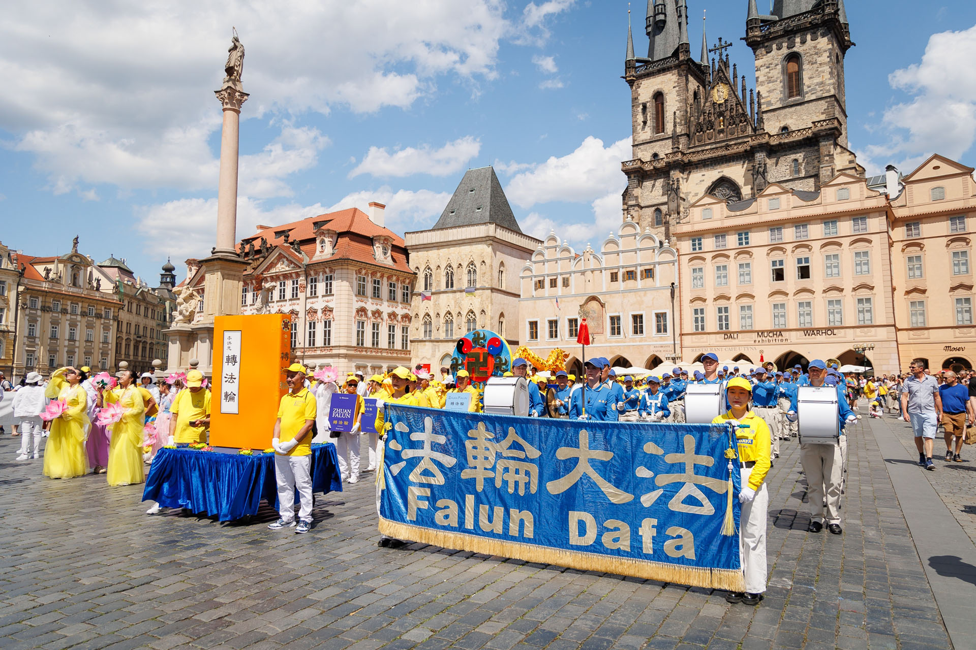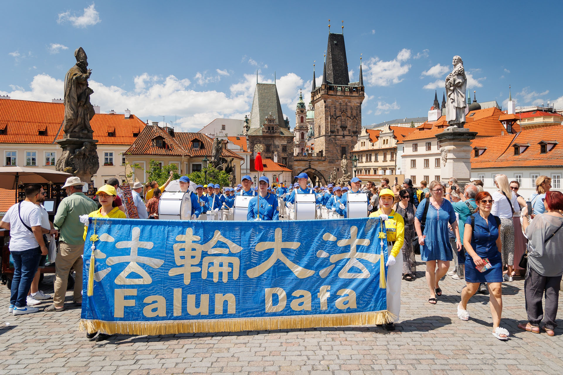 这支独特的游行队伍,向游客展示了布拉格的独特风景,传递了前所未闻的全新讯息。有的游客特意与炼功的学员、天国乐团军乐队、巨型的《转法轮》模型及金色的真、善、忍横幅合影留念。