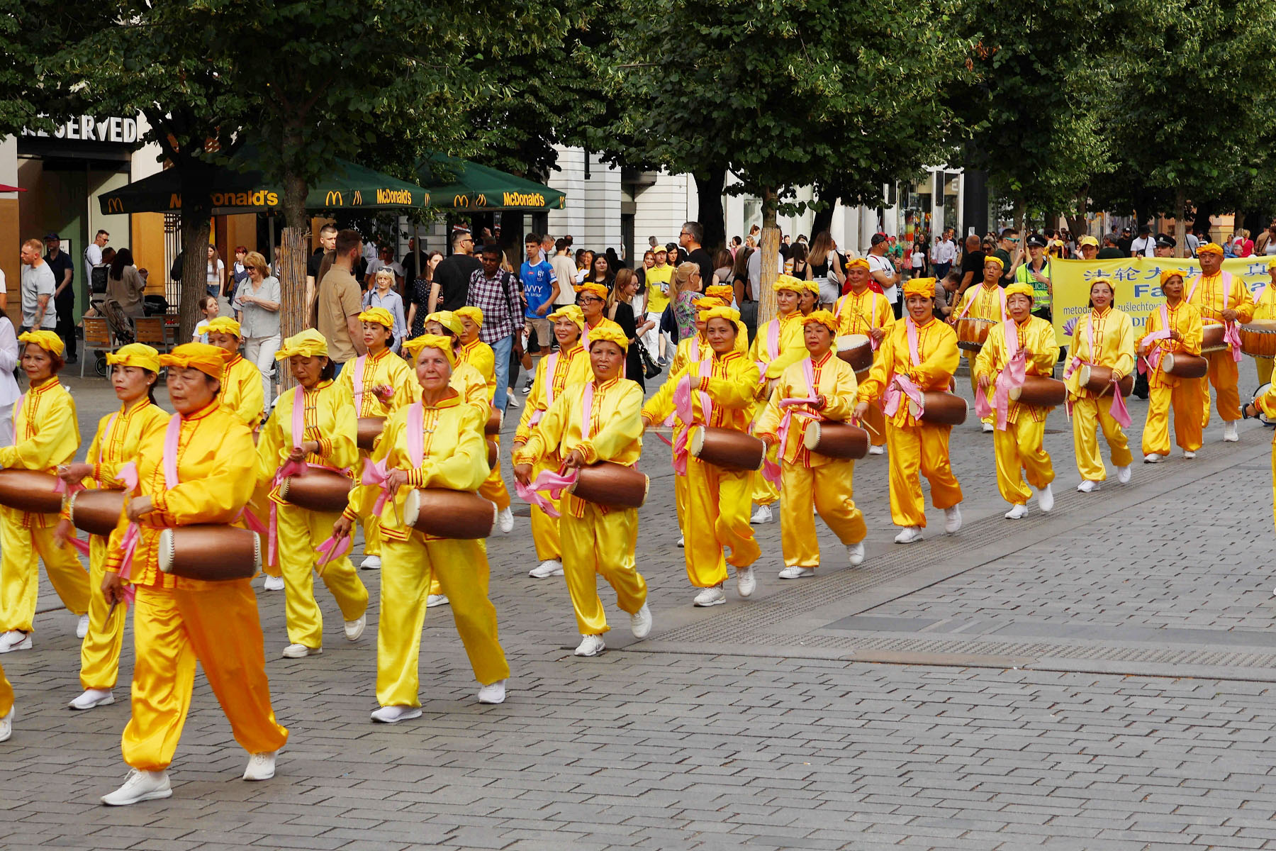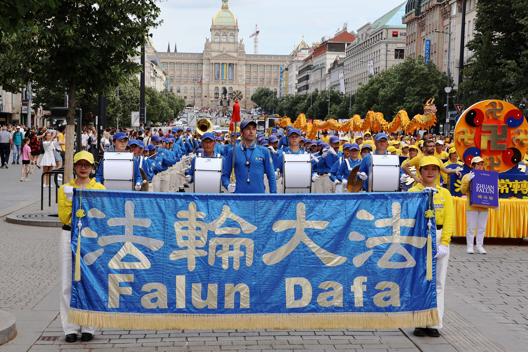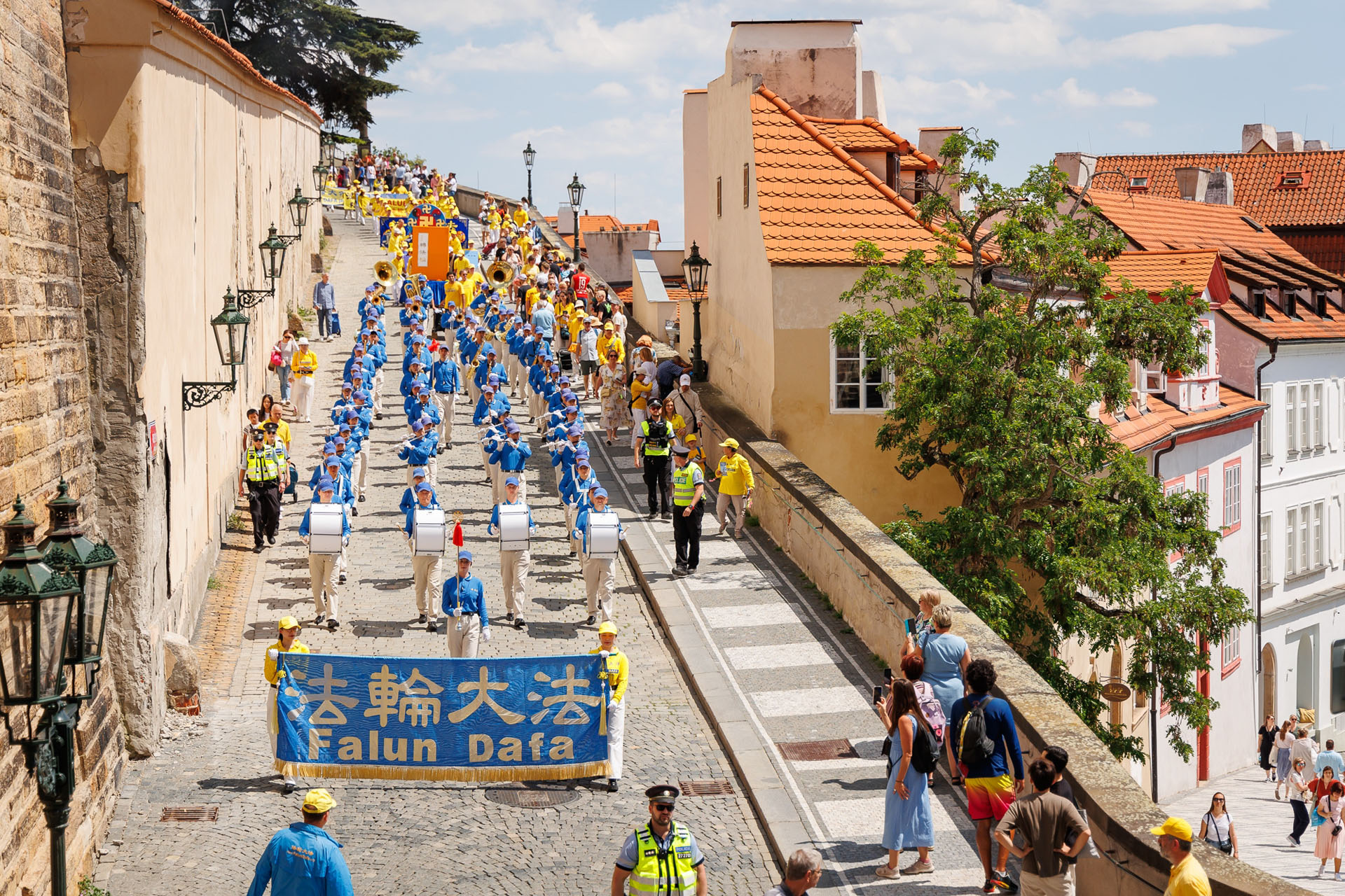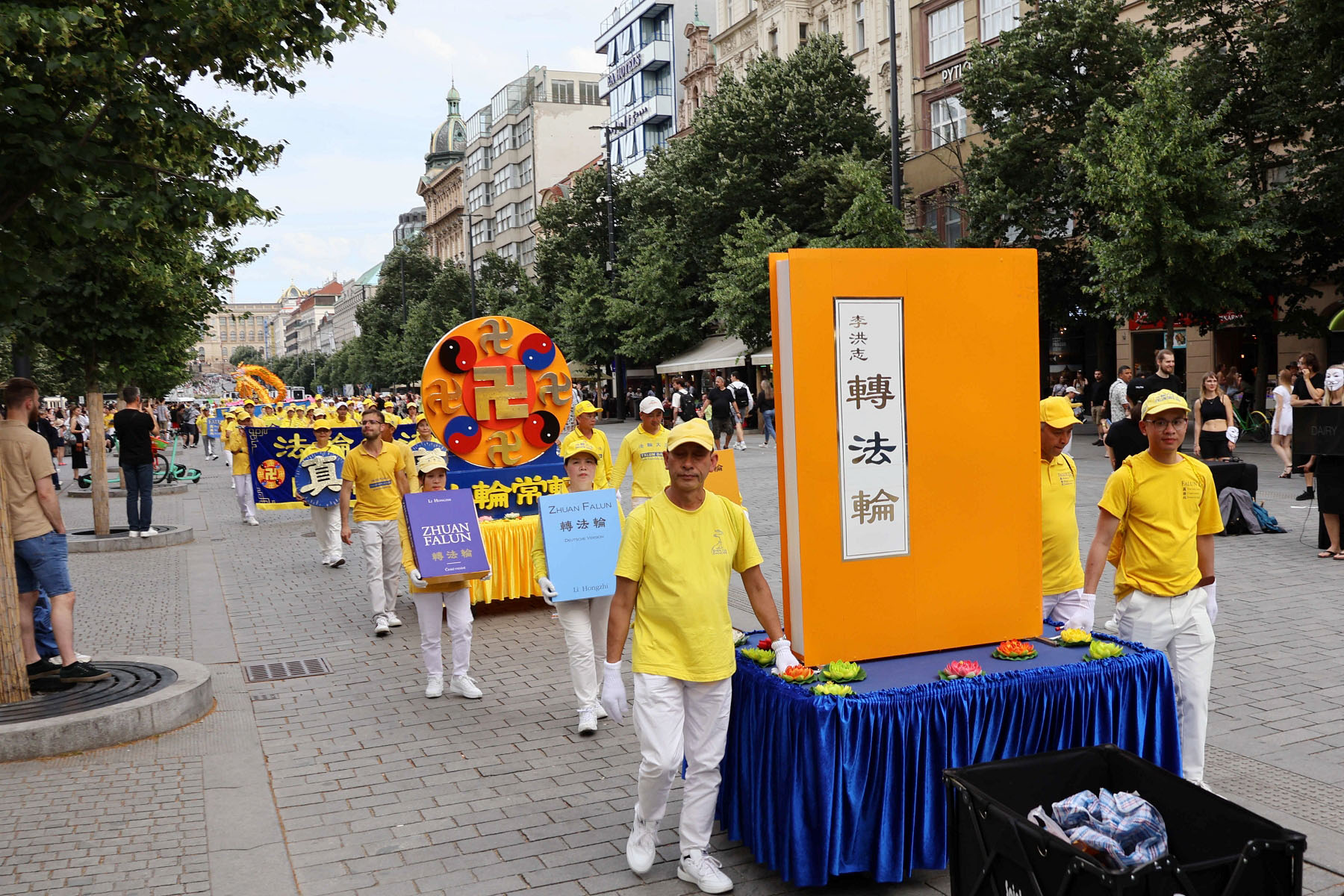 这支独特的游行队伍,向游客展示了布拉格的独特风景,传递了前所未闻的全新讯息。有的游客特意与炼功的学员、天国乐团军乐队、巨型的《转法轮》模型及金色的真、善、忍横幅合影留念。