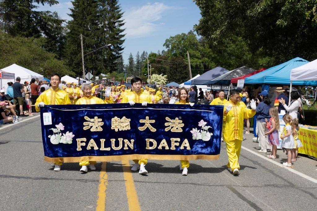 庆典当日,法轮功游行队伍的主体是由西雅图法轮功学员和部分加拿大法轮功学员组成的腰鼓队,伴随着《法轮大法好》的旋律,腰鼓队队员们所敲打出的鼓声整齐壮丽,他们的精彩表演让观众深受感染,掌声和欢呼声此起彼伏。