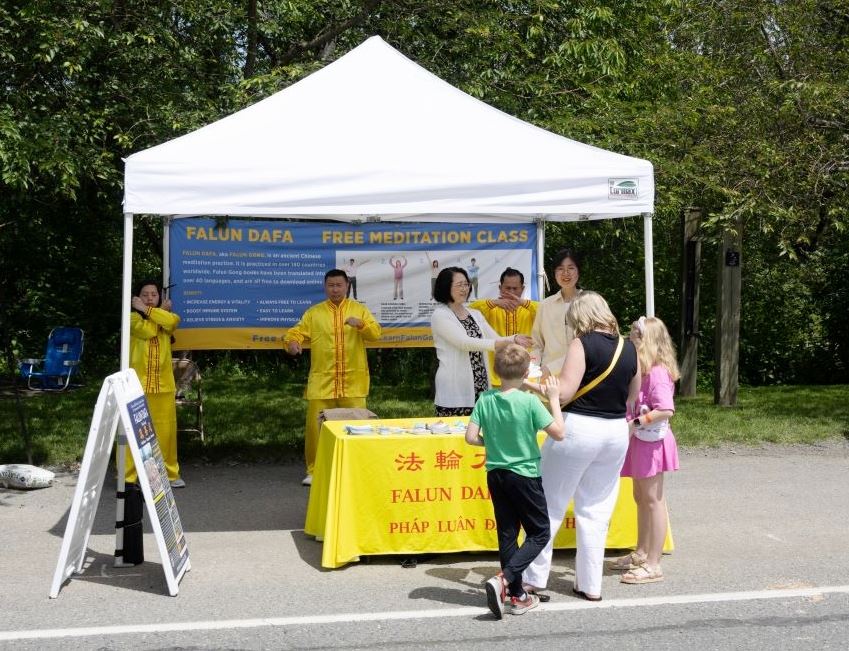 很多人在摊位前驻足,观看功法演示,并和学员们交谈,他们了解了法轮功学员们所遵循的真、善、忍原则,以及法轮功是让人们身心受益、道德提升的修炼,并已经弘传全球一百多个国家和地区。