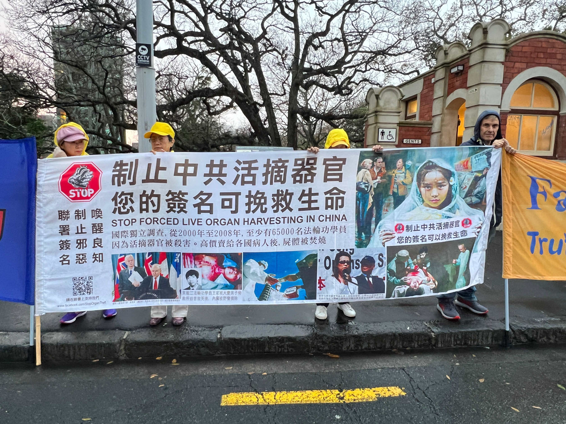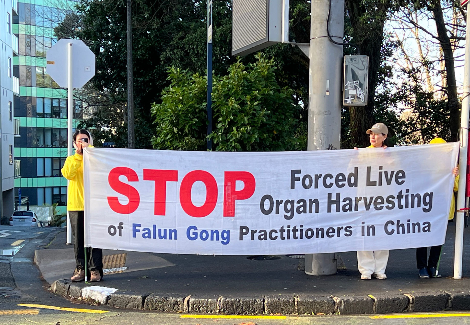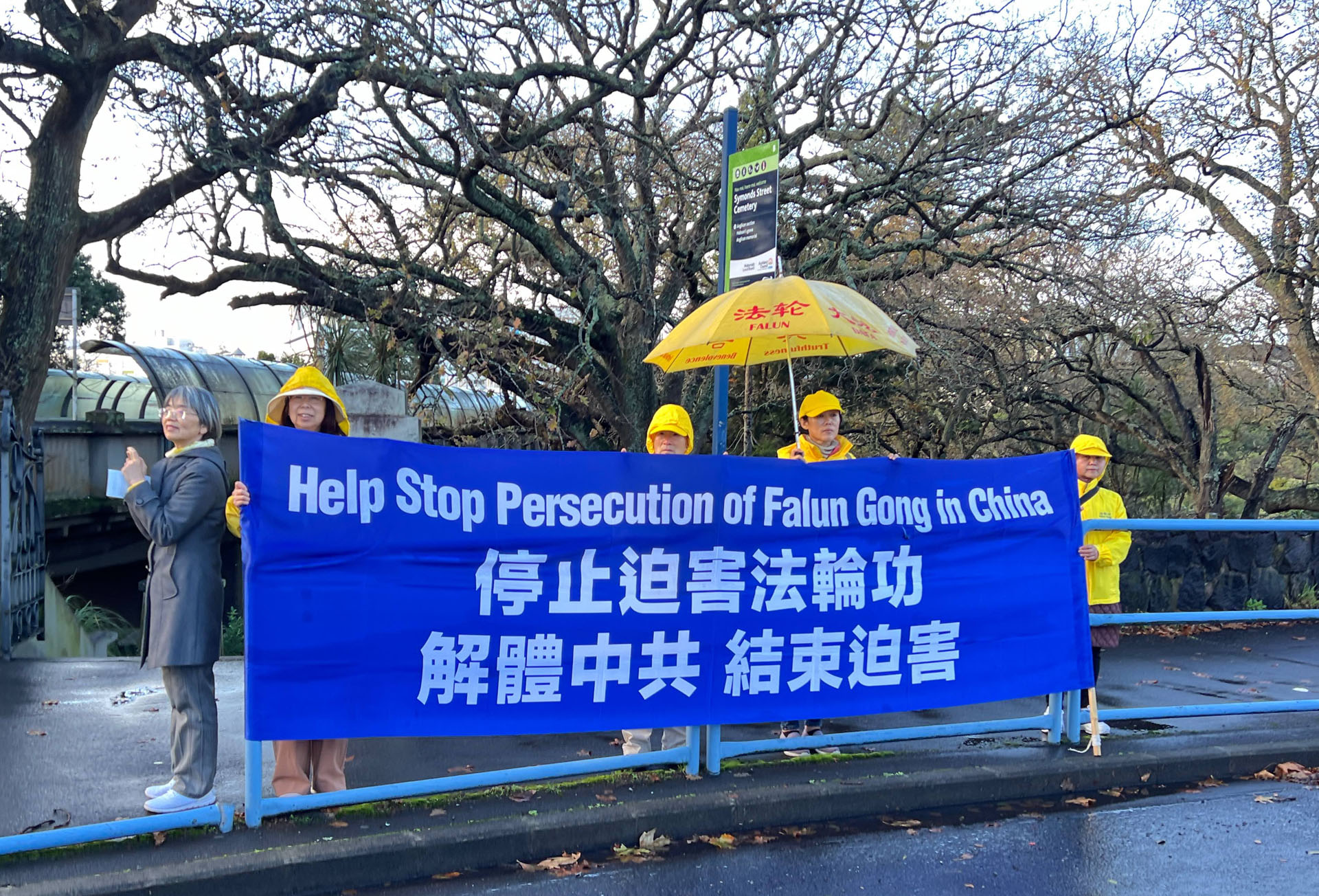 南半球的新西兰现在正值寒冬,活动当天也是寒风夹着冷雨,法轮功学员顶风冒雨和平抗议。中共使领馆雇来几辆大巴车,企图用血旗挡住法轮功学员的横幅。大巴车里的人有的推搡学员;有的故意在学员耳边敲锣打鼓,制造噪音;有的抢夺学员撑横幅用的竹竿;有的用刀划破横幅;有几个甚至动手打人,最后被新西兰警察带走。