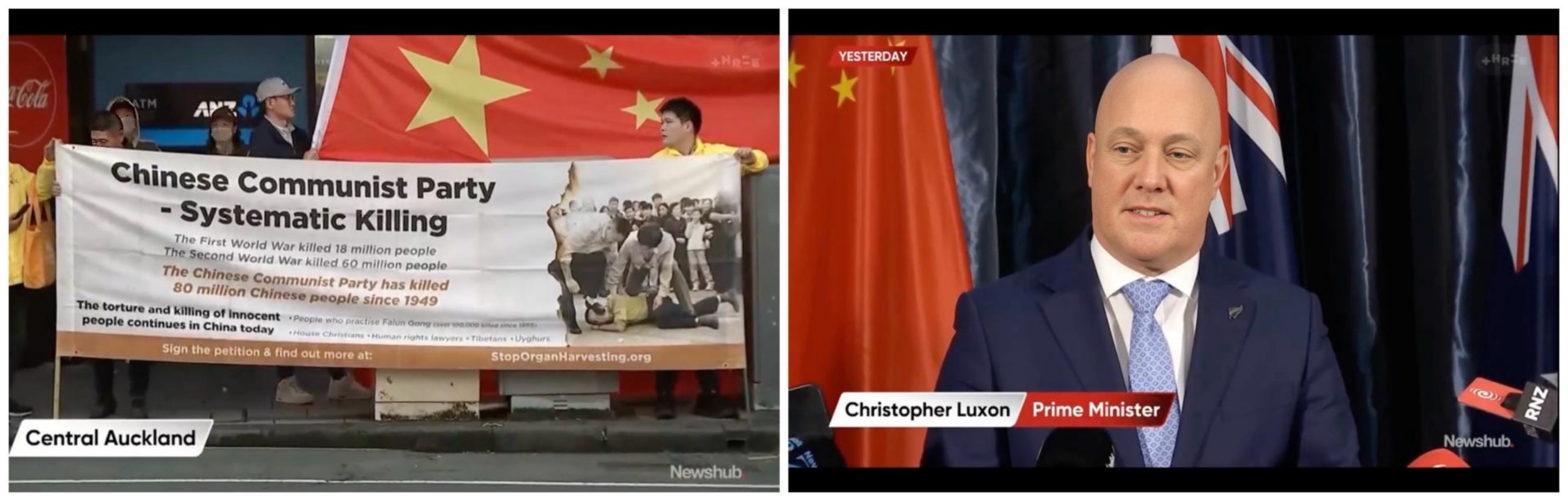 ![]() 图9:新西兰新闻中心(Newshub)的报道,左图为法轮功学员的和平抗议;右图为新西兰总理克里斯托弗·卢克森表明他反对任何外国干涉内政的立场。 |