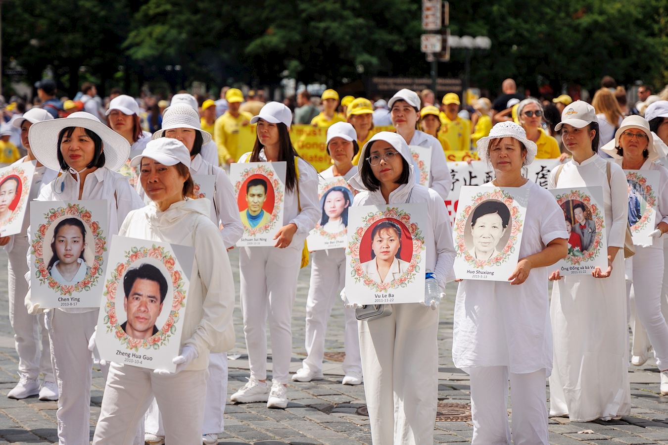 ![]() 图1:游行队伍中,法轮功学员捧着被迫害致死同修的遗照。因中共信息封锁,无法获悉在过去的二十五年里确切有多少位法轮功学员被迫害致死。 |