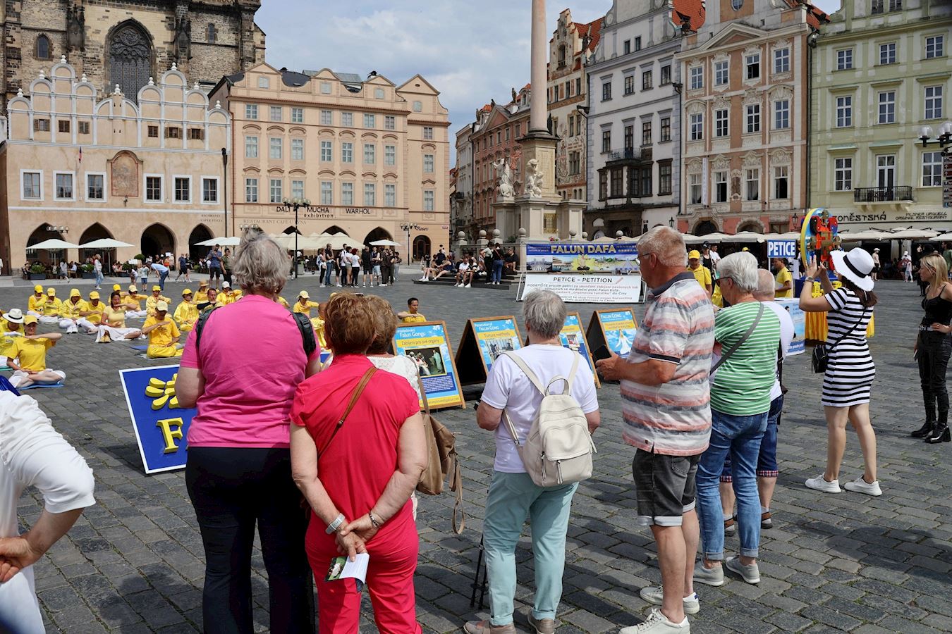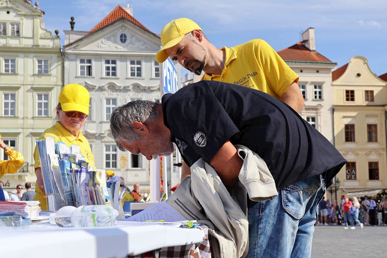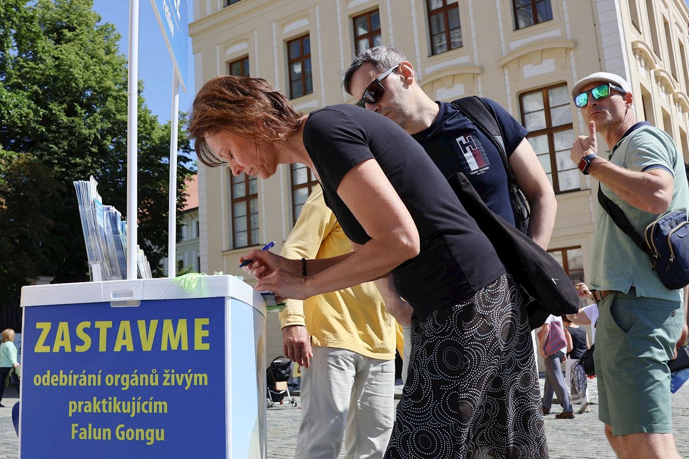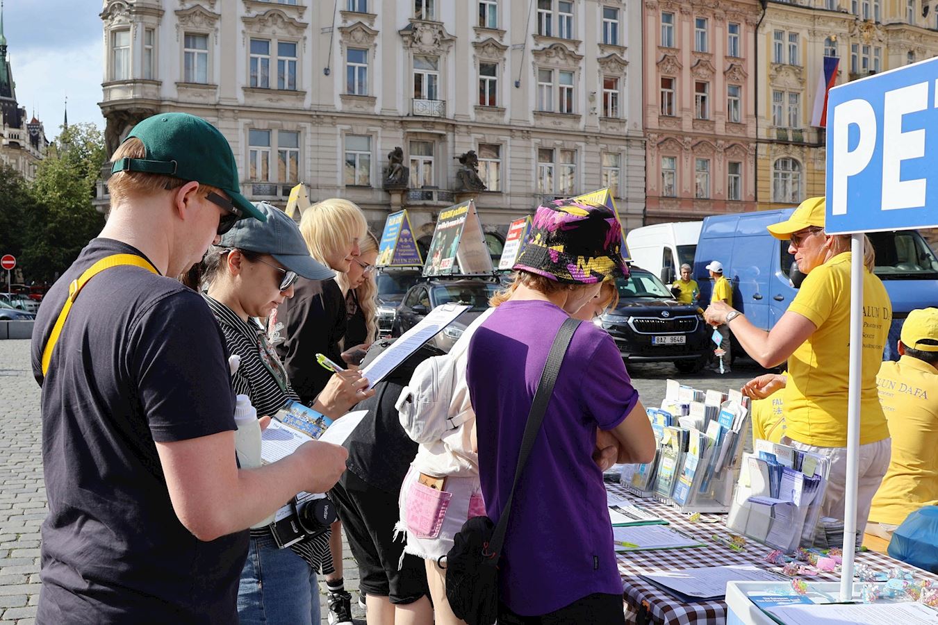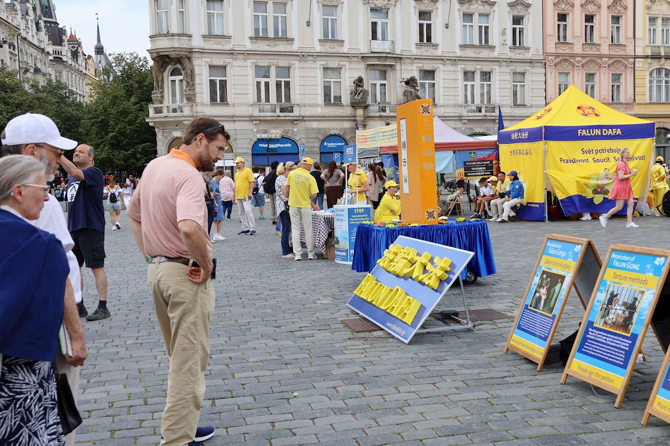游行结束后,队伍回到老城广场。在法轮大法真相展板前,很多学员在此解答路人的提问,并向民众征签,吁请捷克国会,采取更多行动,共同制止迫害。