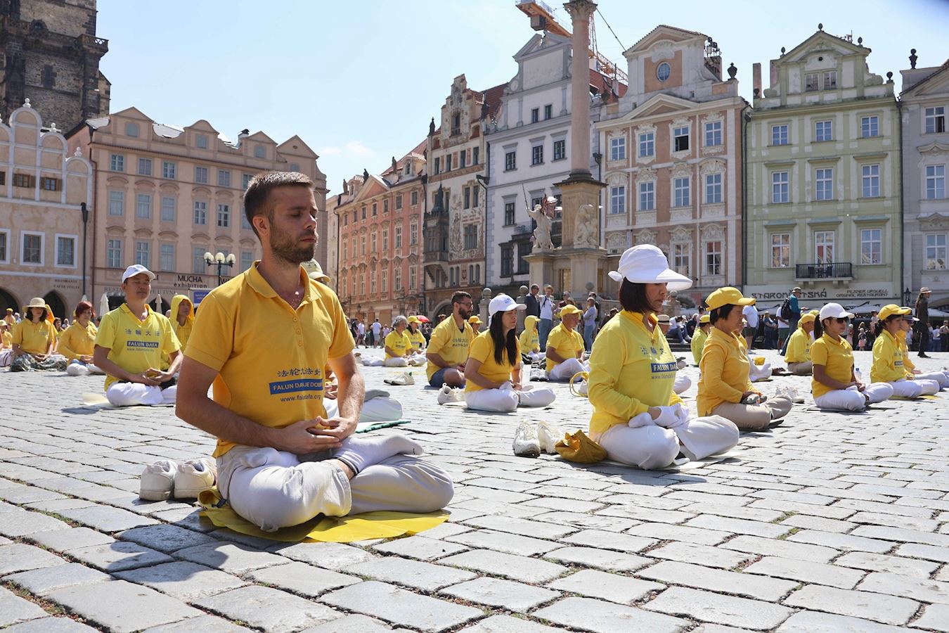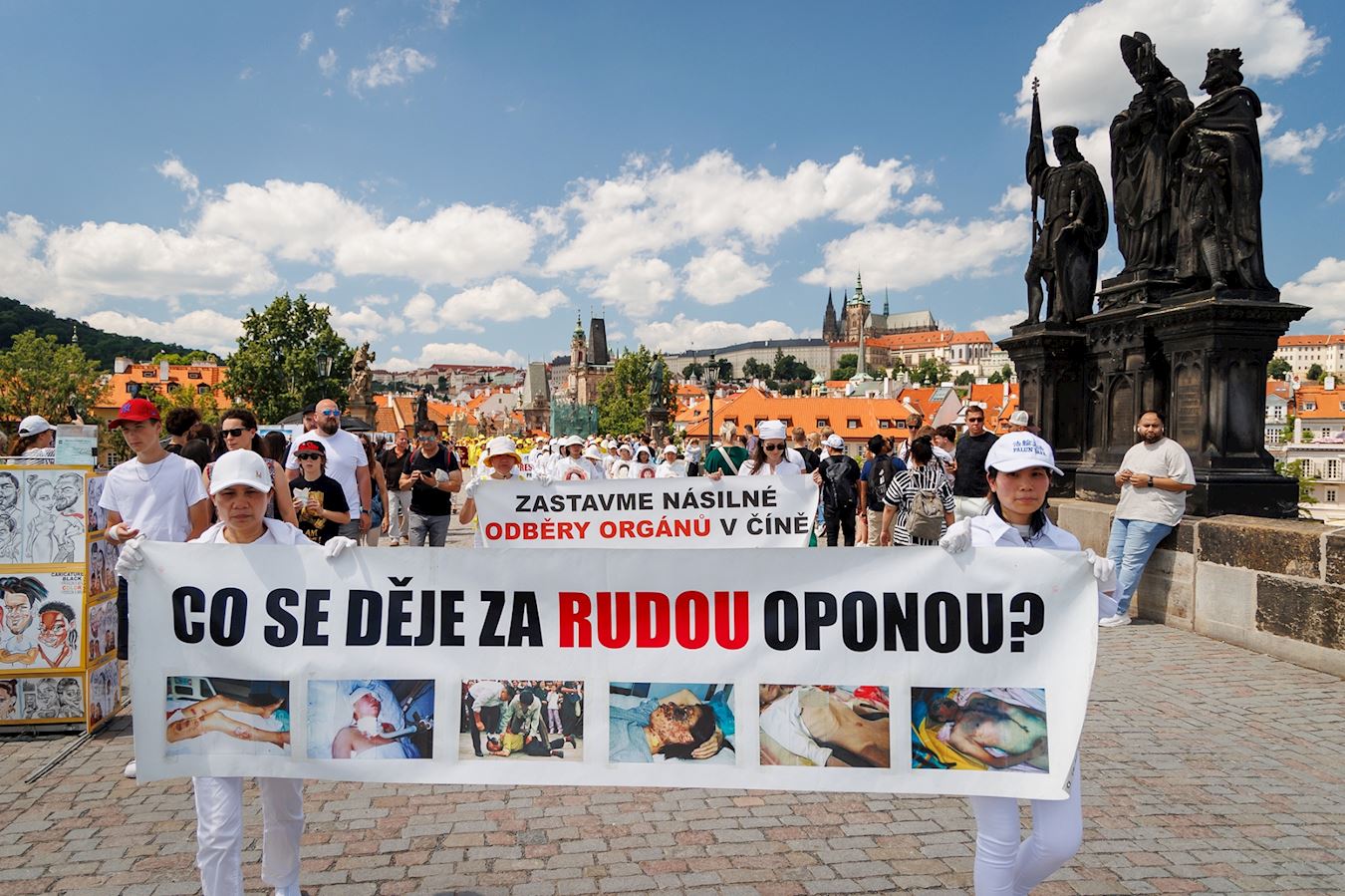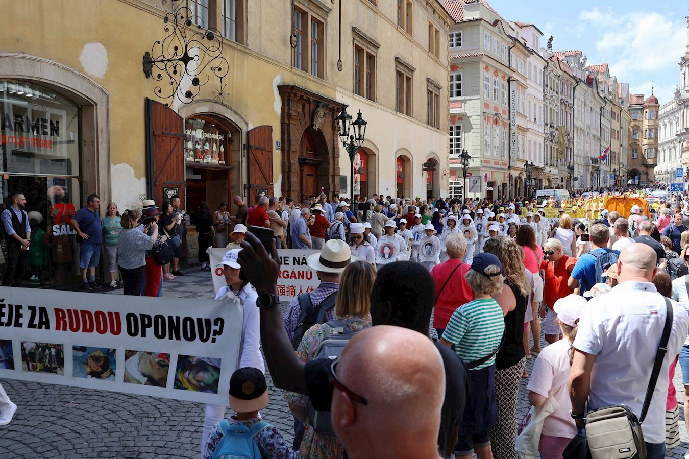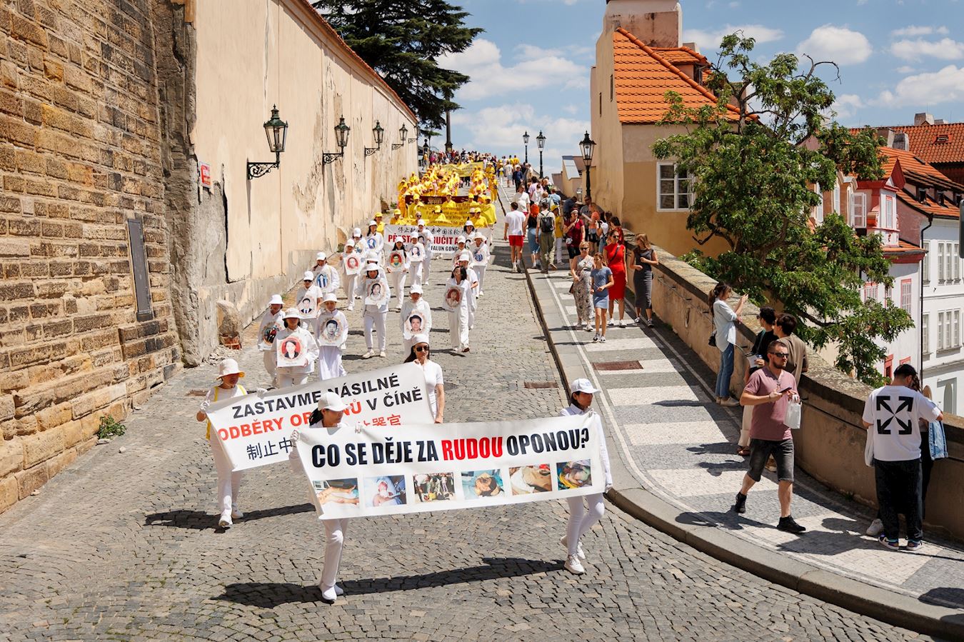 由欧洲法轮功学员发起的集会游行活动前,学员们在演讲中希望让更多人了解法轮大法的美好,以及正在中国发生的对法轮功学员的血腥迫害。游行从城堡广场(Hradcany Square)出发,行经查理大桥(Charles Bridge),而后绕行城市大街小巷。