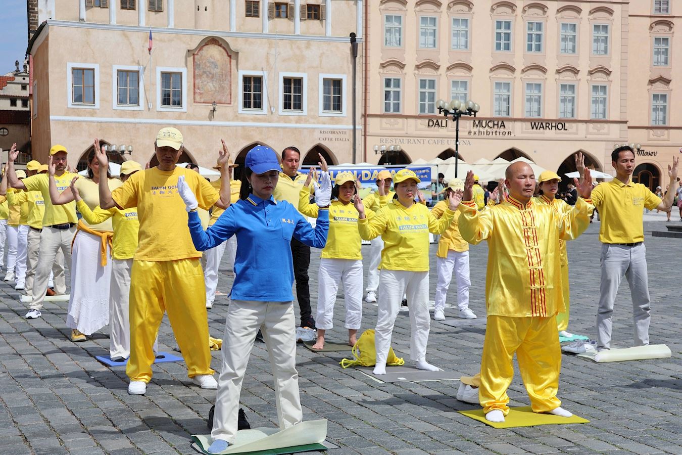 ![]() 图9~10:在两场游行结束后,法轮功学员回到老城广场,演示功法,展现大法的美好。 |